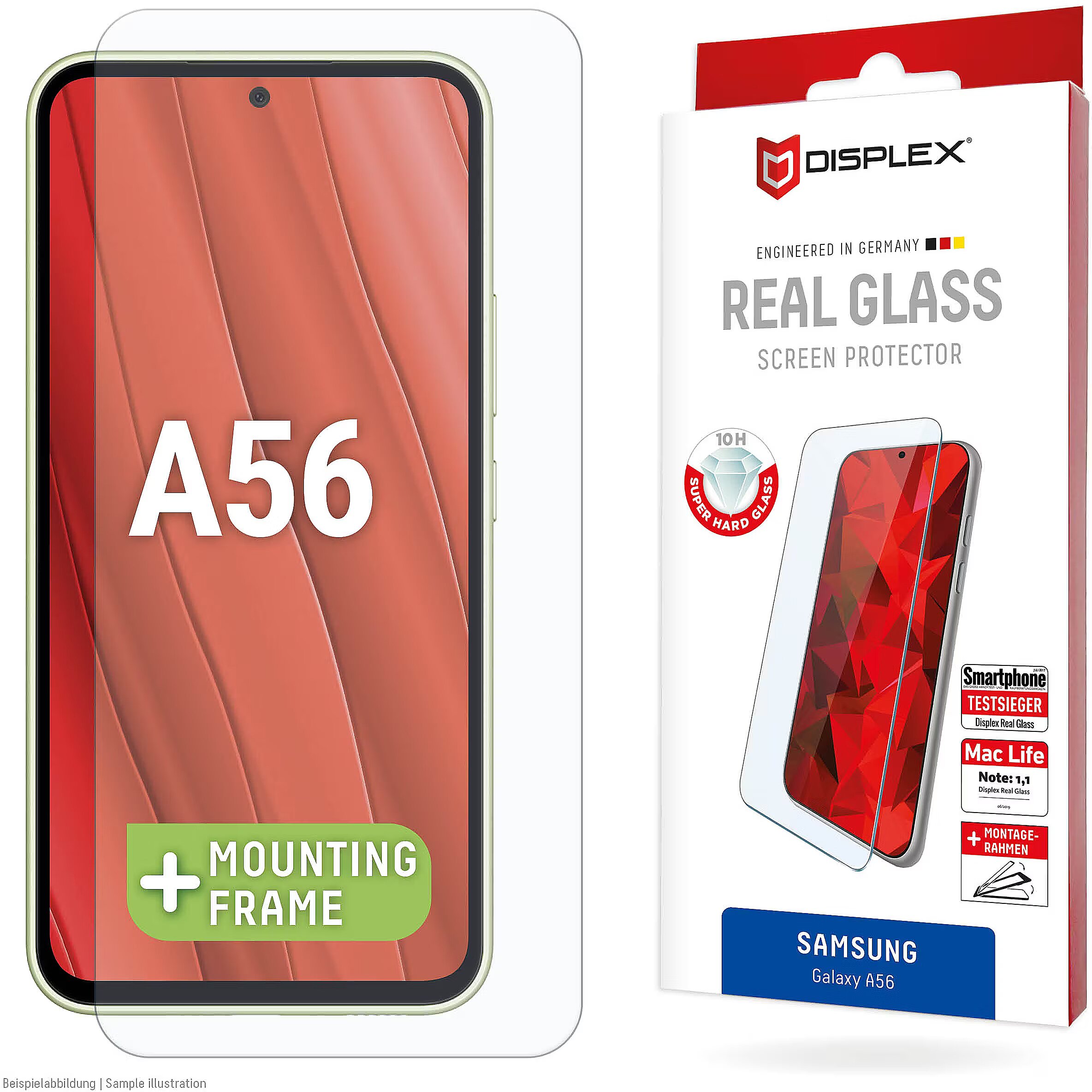 LongSummaryDescription - Displex Screen Protector (10H) for Samsung Galaxy A56, Eco Mounting Frame, scratch resistant. Brand compatibility: Samsung, Compatibility: Galaxy A56. Dry application. Protection features: Dirt resistant, Impact resistant, Scratch resistant. Material: Tempered glass, Product colour: Transparent. Quantity per pack: 1 pc(s)