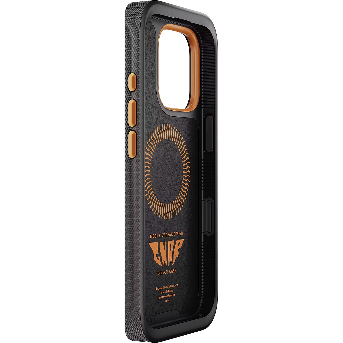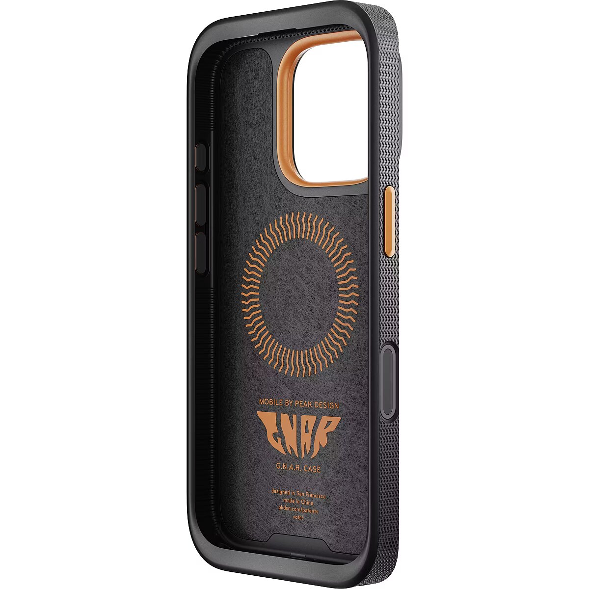 description_en - All the protection, ruggedness, and connect-ability that you could ever want from a phone case, yet with a clean and refined aesthetic—GNAR Case was designed for those individuals who are 'down to clown' but don't want to look like one. Ideal for motorcycling, mountain biking, and the security-loving 'belt-and-suspenders' types. Compared to the Everyday Case, GNAR Case has a bit of extra padding—3.2mm thick (vs. 2.4mm), 4.4mm TPU bumper (vs. 3.4mm), raised camera bezel—yet retains a flat, slim profile that feels svelte in your hand and your pocket. A lightweight recycled polycarbonate body features a smooth scratch-and-stain-resistant finish that's easy to clean. A diamond-knurled edge texture and extra-wide machined/anodized aluminum buttons make GNAR Case easy to handle, even with gloves on. A soft Clarino™ microfiber internal liner keeps your phone pristine, and a removeable USB-C port plug prevents dirt and water ingress in outdoor environments. And of course, it contains brilliant magnetic/mechanical SlimLink™ locking system for instant connection to all Peak Design Mobile mounts, chargers, and accessories. We designed GNAR Case for ultra reliable lightning-fast wireless charging, which can be an issue with some thicker 3rd party cases. It even works with Apple MagSafe chargers and accessories, however compatibility with all 3rd party chargers is not guaranteed. The rugged phone case market is full of needlessly chonky and aggro-styled specimens, each screaming to the world how tough they are. Peak Design hears those desperate screams, and GNAR Case is Peak Design's answer. What does the GNAR acronym stand for? Go Nuts And Ride? Get Naked And Roll? We hope to find out ourselves, someday. For non-supported phone models, try the PD x Nomad Case, Everyday Case, or Universal Adapter. Ultralight 100% recycled polycarbonate body Rubberized TPU bumper, bezels, and USB-C plug Machined & anodized aluminum buttons Soft Clarino™ microfiber internal liner High-temp neodymium magnets High-strength ceramic locking ring (yttria stabilized zirconia)
