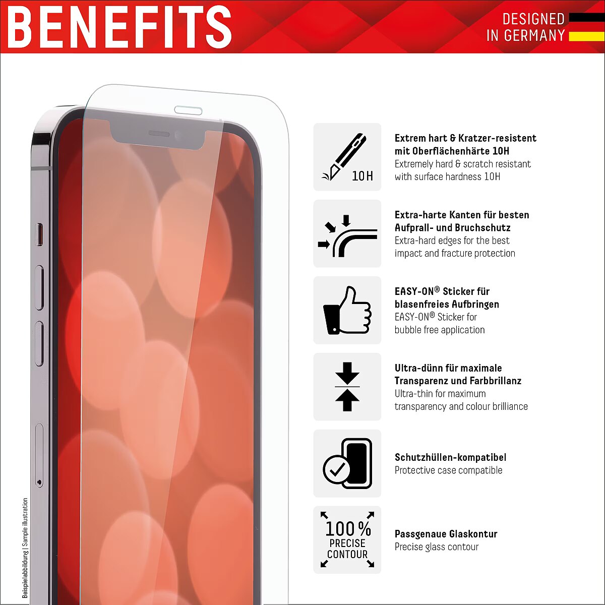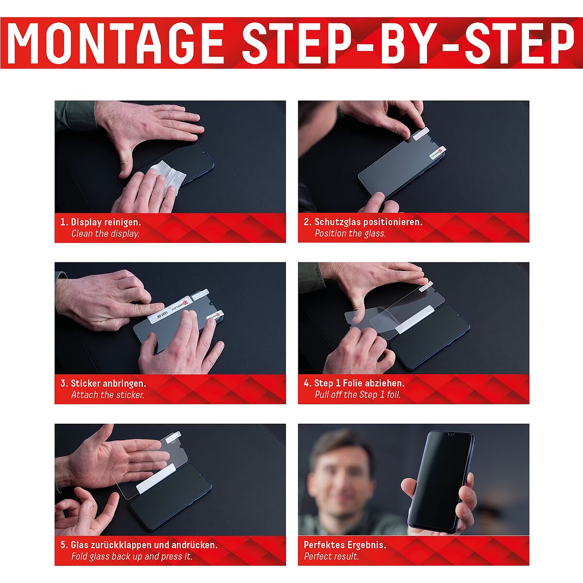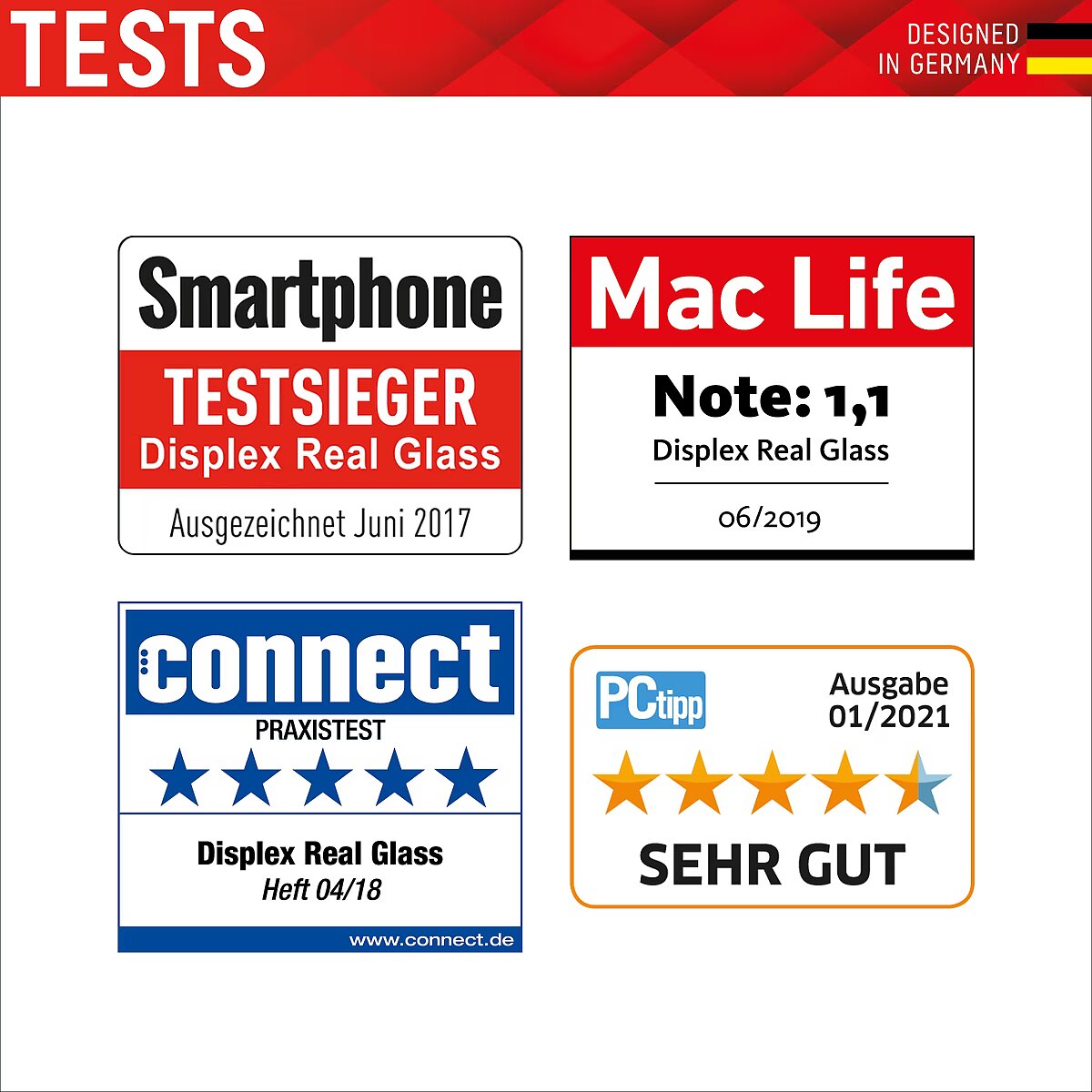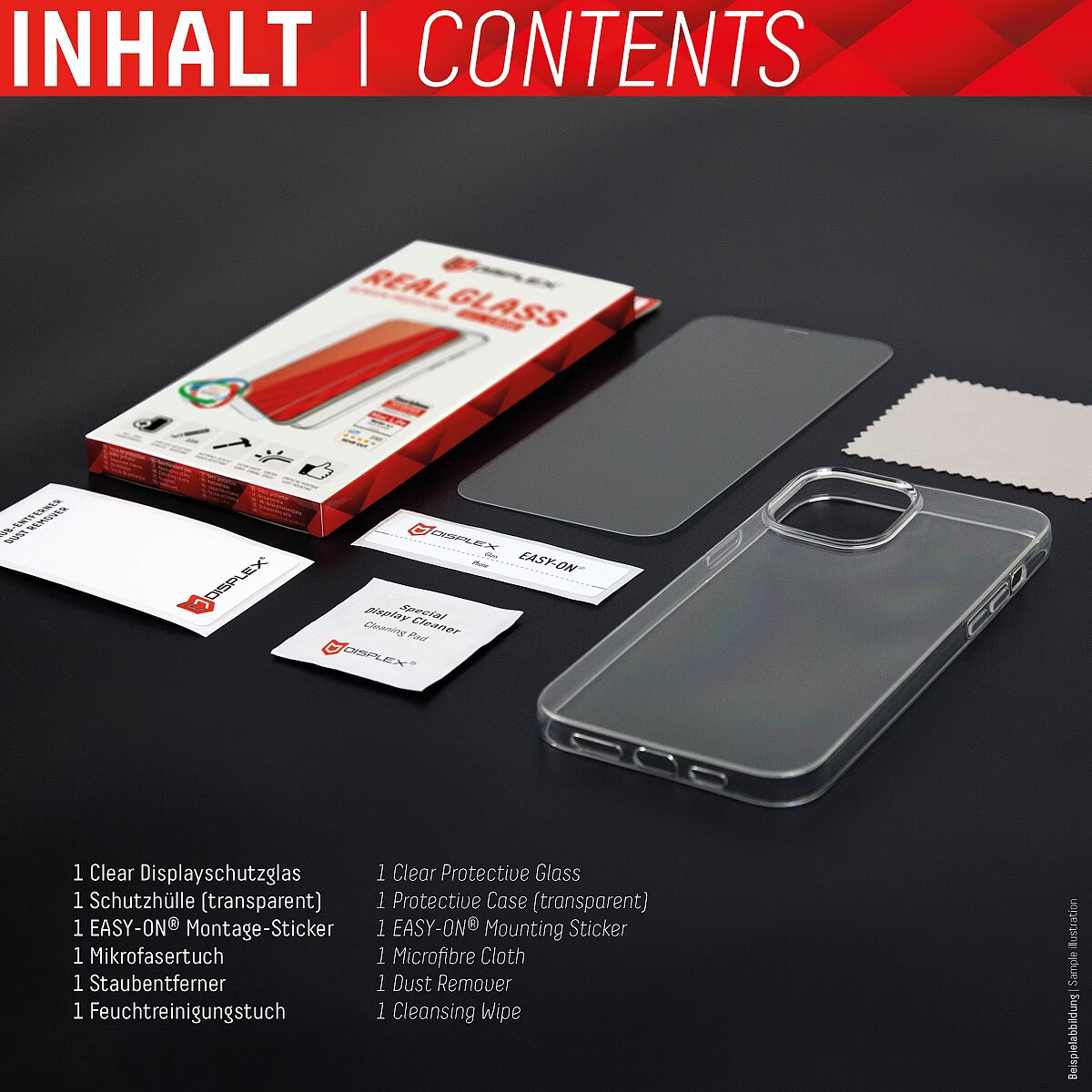 LongDesc - Real Glass (2D) with Case, 360°-Protection with EASY-ON® Stickers Protective case for 360°-protectionOur Displex protective glass is manufactured to within 5/100 mm of the smartphone contours and therefore fits perfectly on your smartphone. In addition, the protective film is ultra-thin at 3mm. This means that the transparent case, that is included in this product, can be used perfectly with the screen protection glass. But also all other standard-sized protective cases can be used with the screen protector. Thus, your smartphone is optimally protected all around by a combined protection of the Displex Tempered Glass and your favourite case. Tempered glass with rounded edgesAll Displex protective glasses have a surface hardness of 10H and are therefore not only more scratch-, break- and shock-resistant than comparable brand products, but even surpass sapphire glass, which is used in luxury watches and has a hardness of 9H.Even the edges, the area of the smartphone and protective glass most susceptible to breakage and impact, are specially hardened, rounded by 4-fold polishing and finished with a shock-absorbing edge. This elaborate production process further increases the protection against knocks and bumps and allows a particularly pleasant use of the smartphone. With these features, the protective glass is extremely resistant and guarantees maximum breakage resistance. Case-friendlyOur Displex protective glass is manufactured to within 5/100 mm of the smartphone contours and therefore fits perfectly on your smartphone. In addition, the protective film is ultra-thin at 3mm. This means that all standard-sized protective cases can be used with the screen protection glass. Thus, your smartphone is optimally protected all around by a combined protection of the Displex Tempered Glass and your favourite case. Anti fingerprint coatingThe top layer of our 4-Layer Technology is a high-tech plasma coating. With an extremely long-lasting effect, this coating effectively repels fingerprints. In addition, the plasma coating guarantees a soft scrolling experience. This technology not only makes your display look better, but it also keeps it cleaner and therefore requires less frequent cleaning. High-tech splinter protectionThe high-tech shatter protection integrated in the Real Glass from Displex guarantees absolute safety even if the protective glass breaks. Thanks to the composite material of the second layer in the protective glass, it does not shatter and thus guarantees absolutely safe use. If the worst should come to the worst and the protective glass has absorbed a blow, fall or impact and is broken, the Displex protective glass can be easily pulled off the display in one piece thanks to the integrated high-tech shatter protection. High-performance adhesiveOnce the protective glass has been fitted, the high-performance adhesive ensures optimum adhesion properties and a clear look. The adhesive is adapted to all display coatings of the various manufacturers so that the protective film for mobile phones holds reliably in the long term. The visual appearance is not affected either: despite the screen protection film, you can enjoy gripping videos and photos with maximum transparency and colour fidelity. Simple & bubble-free applicationWith the EASY-ON® Sticker and the accompanying video tutorials, mounting the Tempered Glass is incredibly quick, easy and precise. The result is worth seeing: no crooked positioning of the screen protector on the display, no hidden openings for speakers or microphones and certainly no bubbles under the protective glass.