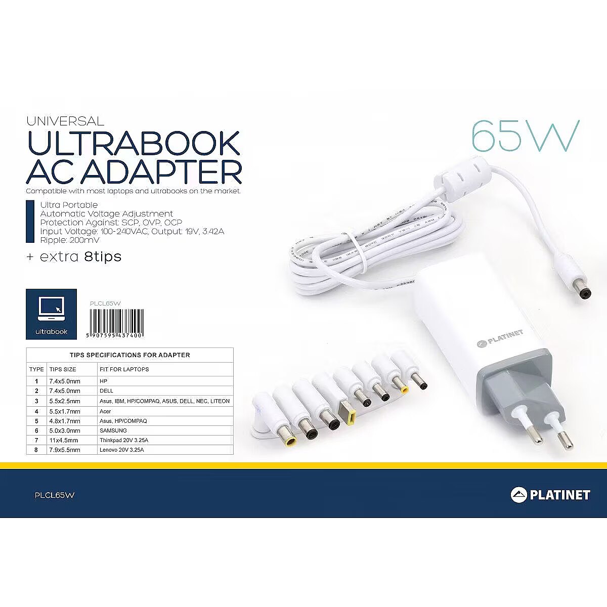 This product Platinet PLCL65W Universal 65W 3.42A 19V AC Charger for Asus / HP / Dell / Acer / IBM / Lenovo / Samsung / Notebooks White