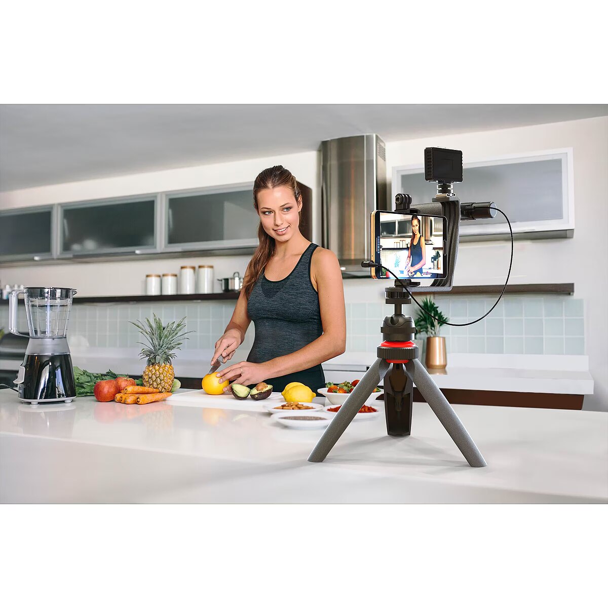 description_short_en - All-in-one smartphone video set Includes videolight, microphone, tripod, etc. Suitable for smartphones with a 3.5 mm jack Removable built-in wireless remote Perfect for starting vlogger