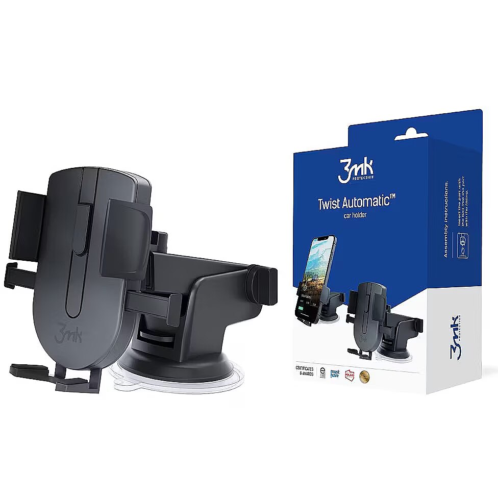 Description - 3mk Twist Automatic Car Holder The holder is equipped with a telescopic arm so you can bring your phone closer to the windshield, and the rotating head allows you to set it at the right angle.   Stable and delicate The basic task of a car holder is a strong, stable grip. That is why we have focused on sensitive automation, which will perfectly adjust the clamp to the width of the phone. Thanks to this, your phone will not fall out of the holder even when you drive on bumps or take sharp turns. The clever, blue elements of the clamps will react to movement, gently but firmly clamping on the phone casing. With Twist Automatic car holder you can be sure that your phone is safe on every road. Always in the optimal position Our holder masterfully adapts to the driver's preferences. The telescopic arm will allow you to bring the phone attached to the windshield closer, and the rotating head will allow you to set it at the right angle. Thanks to this, you will be able to comfortably and safely use your phone while driving. What's more, you can attach Twist Automatic not only to the windshield, but also to the dashboard. Thanks to modern mounting technology, our holder will not fall off by itself while driving, ensuring a stable image on your phone's display. Easy to assemble Want to change the mounting location? No problem. Clean&Use technology allows for multiple mounting and dismounting of the holder without losing its adhesion properties. Each time, the suction cup adheres strongly to the surface, ensuring full comfort of using the navigation on the phone. Importantly, changing the mounting location of the holder takes literally a moment. You release and attach the suction cup using a convenient valve button. One click and it's done. With Twist Automatic your phone is always where you want it. Charge while you go Long car journeys can be exhausting, especially for your phone's battery. Our holder has a practical cutout that allows you to connect your charging cable while driving. Convenient and safe. Looking for a reliable travel companion? Choose Twist Automatic car holder!