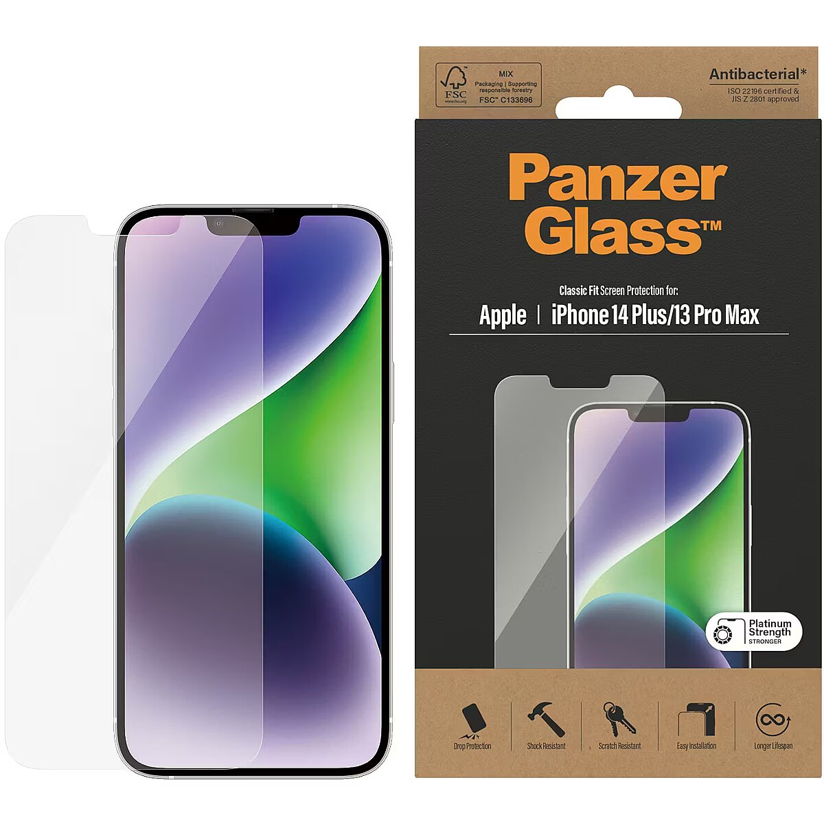 LongSummaryDescription - PanzerGlass ® Screen Protector iPhone 14 Plus | 13 Pro Max | Classic Fit. Brand compatibility: Apple, Compatibility: Apple - iPhone 14 Plus, Apple - iPhone 13 Pro Max. Dry application. Protection features: Scratch resistant, Shock resistant, Anti-bacterial. Material: Tempered glass, Polyethylene terephthalate (PET), Silicone, Product colour: Transparent. Quantity per pack: 1 pc(s)