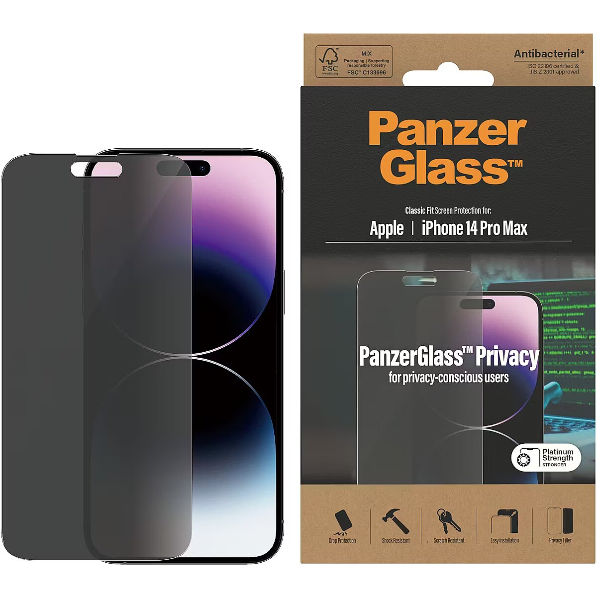 LongSummaryDescription - PanzerGlass ® Privacy Screen Protector iPhone 14 Pro Max | Classic Fit. Brand compatibility: Apple, Compatibility: Apple - iPhone 14 Pro Max. Dry application. Protection features: Scratch resistant, Shock resistant, Anti-bacterial. Privacy filtering function, Material: Tempered glass, Polyethylene terephthalate (PET), Silicone, Product colour: Transparent. Quantity per pack: 1 pc(s)