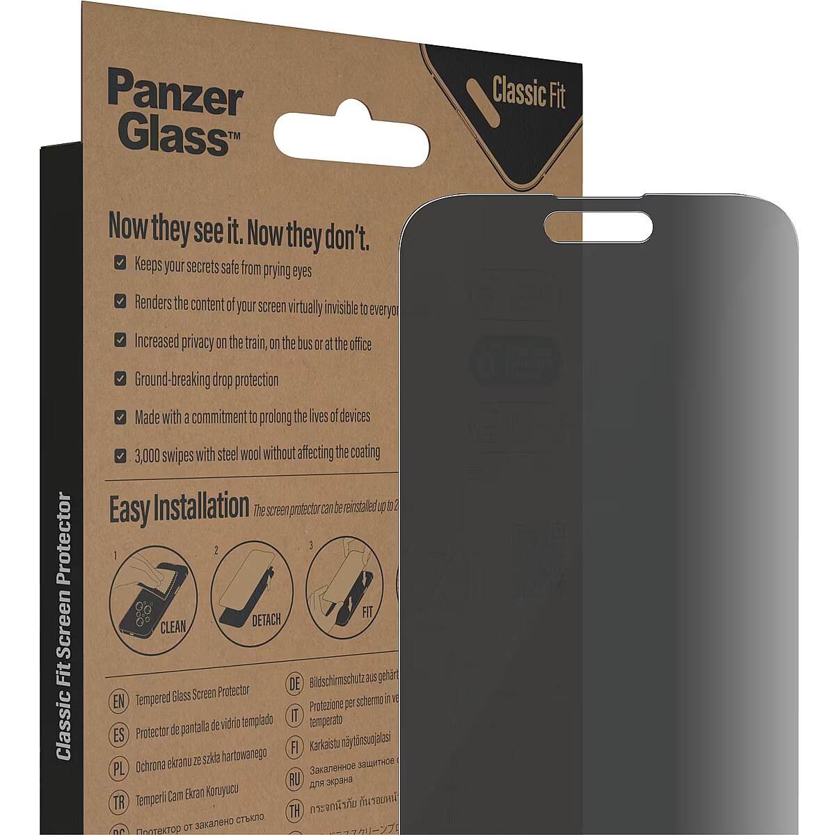 LongDesc - Private messages. Bank details. Pin codes. With this screen protector from PanzerGlass®, your secrets are safe from the prying eyes of people sitting next to you on the train, on the bus or in the office. The specially designed privacy filter renders the content of your screen virtually invisible to everyone except you.Accidental bumps against sharp-edged dangers in your pocket or crushing falls onto stone-hard pavements are also no match for this scratch and shock-resistant screen protector, which provides high-level drop protection. It even has a smudge-free coating with antibacterial effect that reduces traces of fingerprints and kills up to 99.99% of all common surface bacteria.Installation is easy peasy. Usually one attempt is enough, and should you need more, don’t worry: the screen protector can be re-installed up to 200 times. And once it’s installed, you’ll never again fear the sight of your phone tumbling to the ground. This may not happen, but if it does, you’ll regret not having clicked “add to cart”.The Classic Fit screen protector covers the active part of your screen and comes in FSC™-certified packaging that can be recycled