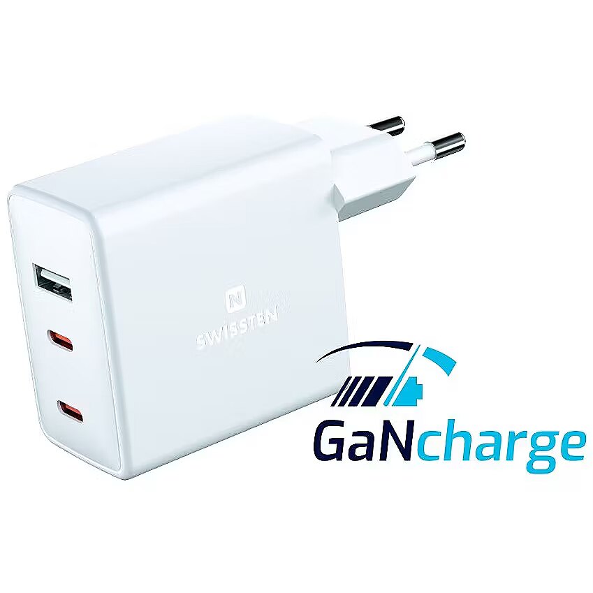 description_en - Charger from new series of SWISSTEN mini chargers with the revolutionary GaN technology. The charger is equipped with two USB-C outputs with Power Delivery fast charging technology and one USB 5W output with total power of 70W. GaN Technology