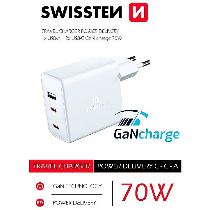 title_en - Swissten GaN Travel Charger 2 x USB-C / USB / 70W