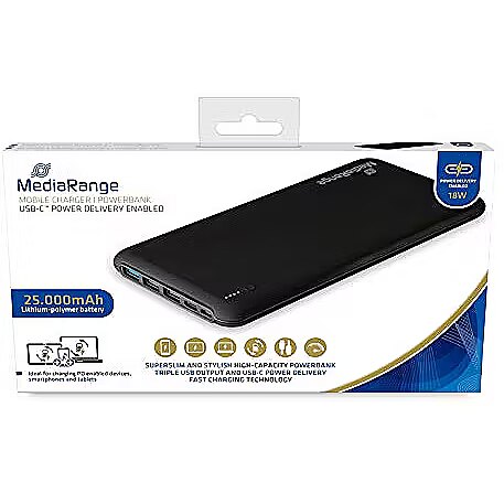 Description - MediaRange Mobile charger I Powerbank 25.000mAh, 3x USB-A and 1x USB-C®, supports USB-C® Power Delivery and Quick Charge™, black MediaRange Powerbanks are your ideal travel companion. Whether for smartphone, tablet or other devices: With our powerful USB Power Banks you have always your reliable power supply.The compact and lightweight batteries are rechargable via the included USB charging cable to the computer or an optional AC adapter to the wall outlet and can be used immediately. Rechargeable Lithium-polymer battery: 25.000mAh I 3.7V I 92Wh USB Type-C® Input: DC 5.0V⎓3.0A or 9.0V⎓2.0A (18.0W max.) Micro USB Input: DC 5.0V⎓2.0A or 9.0V⎓2.0A (18.0W max.) Quick Charge™ 3.0 USB-A1, USB-A2 and USB-A3 output: DC 4.5V ⎓ 5.0A or DC 5.0V ⎓ 3.0A or DC 9.0V ⎓ 2.25A or DC 12.0V ⎓ 1.67A (22.5W max.) USB Type-C® Power Delivery 3.0 output: DC 5.0V ⎓ 3.0A or DC 9.0V ⎓ 2.23A or DC 12.0V ⎓ 1.67A (20W max.) Suitable for simultaneous charging of devices: USB-A1 + USB-A2 + USB-A3 + USB Type-C®output: DC 5.0V ⎓ 3.0A (15W max.) LED battery level and charging mode indicator, overvoltage protection, overcharge protection, discharge protection and short circuit fuse Charging cycles: >500 USB Type-C® to USB charging cable included (approx. 30cm)