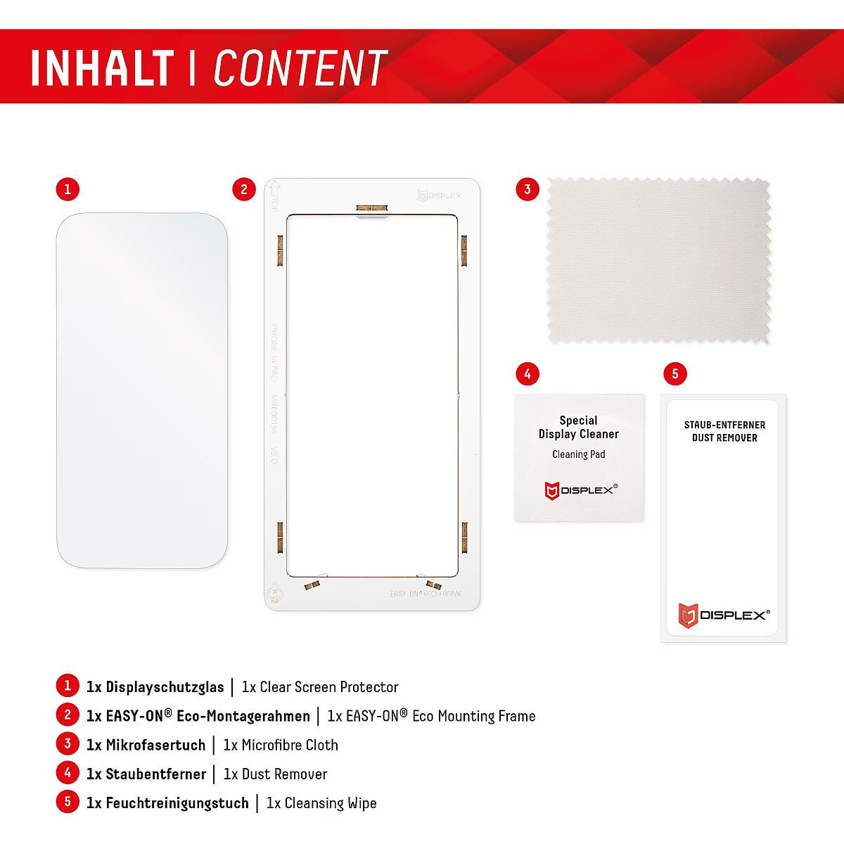 LongDesc - Real Glass (2D) with EASY-ON® Eco Mounting Frame Tempered glass with rounded edgesAll Displex protective glasses have a surface hardness of 10H and are therefore not only more scratch-, break- and shock-resistant than comparable brand products, but even surpass sapphire glass, which is used in luxury watches and has a hardness of 9H.Even the edges, the area of the smartphone and protective glass most susceptible to breakage and impact, are specially hardened, rounded by 4-fold polishing and finished with a shock-absorbing edge. This elaborate production process further increases the protection against knocks and bumps and allows a particularly pleasant use of the smartphone. With these features, the protective glass is extremely resistant and guarantees maximum breakage resistance. Case-friendlyOur Displex protective glass is manufactured to within 5/100 mm of the smartphone contours and therefore fits perfectly on your smartphone. In addition, the protective film is ultra-thin at 3mm. This means that all standard-sized protective cases can be used with the screen protection glass. Thus, your smartphone is optimally protected all around by a combined protection of the Displex Tempered Glass and your favourite case. Anti fingerprint coatingThe top layer of our 4-Layer Technology is a high-tech plasma coating. With an extremely long-lasting effect, this coating effectively repels fingerprints. In addition, the plasma coating guarantees a soft scrolling experience. This technology not only makes your display look better, but it also keeps it cleaner and therefore requires less frequent cleaning. High-tech splinter protectionThe high-tech shatter protection integrated in the Real Glass from Displex guarantees absolute safety even if the protective glass breaks. Thanks to the composite material of the second layer in the protective glass, it does not shatter and thus guarantees absolutely safe use. If the worst should come to the worst and the protective glass has absorbed a blow, fall or impact and is broken, the Displex protective glass can be easily pulled off the display in one piece thanks to the integrated high-tech shatter protection. High-performance adhesiveOnce the protective glass has been fitted, the high-performance adhesive ensures optimum adhesion properties and a clear look. The adhesive is adapted to all display coatings of the various manufacturers so that the protective film for mobile phones holds reliably in the long term. The visual appearance is not affected either: despite the screen protection film, you can enjoy gripping videos and photos with maximum transparency and colour fidelity. Simple & bubble-free applicationWith the EASY-ON® Eco Mounting Frame and the accompanying video tutorials, mounting the tempered glass is incredibly quick, easy and precise. In addition the EASY-ON® Eco Mounting Frame is made of premium solid cardboard and is therefore not only sustainable, but also a 100% recyclable. The result is worth seeing: no crooked positioning of the screen protector on the display, no concealed openings for speakers or microphones and certainly no bubbles under the protective glass.