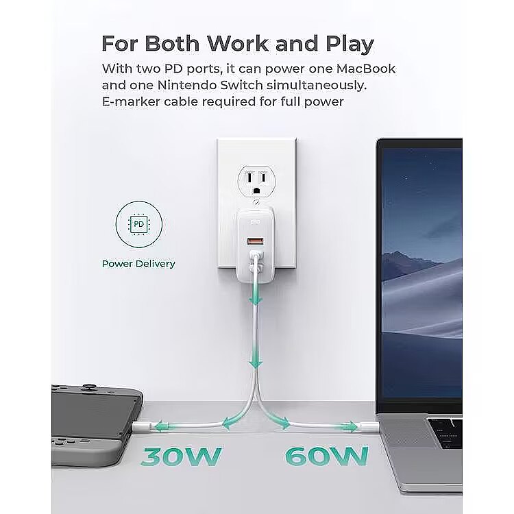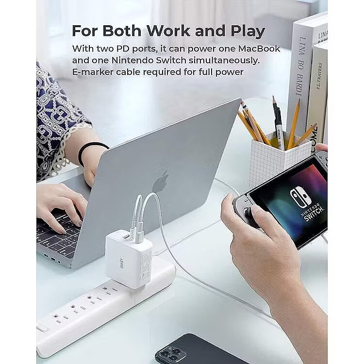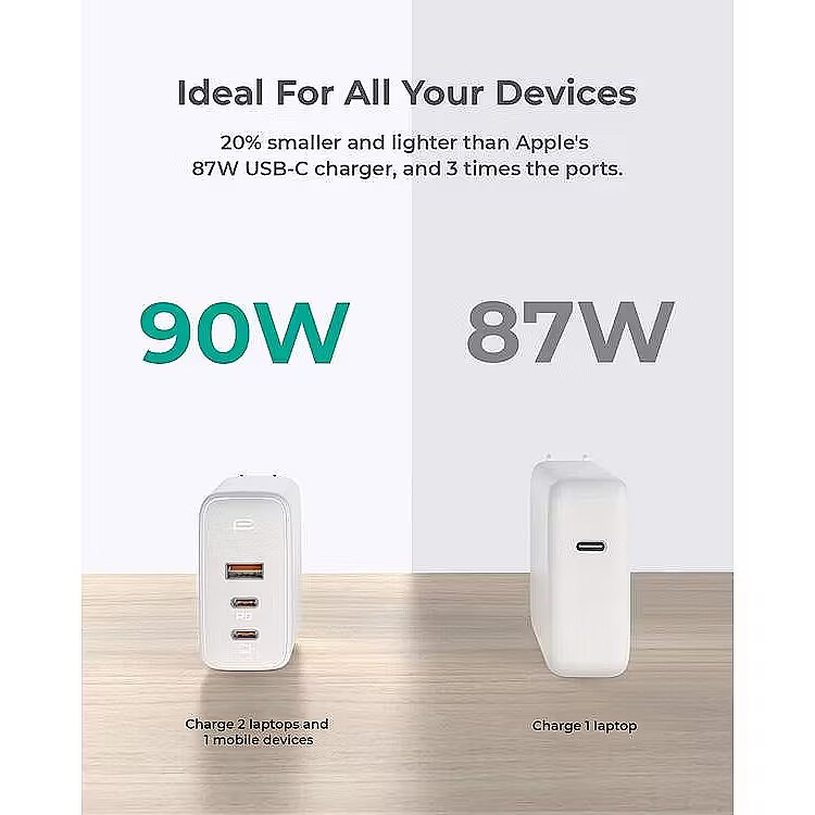 Description - Szybkie ładowanie: oferuje ładowanie 90W Power Delivery 3.0 z jednego portu USB-C, aby ładować MacBooka Pro z pełną prędkością i szybko ładować najnowszy iPhone lub inne zgodne urządzenia zasilane przez USB-C, które obsługują USB Power Delivery. Naładujesz Swojego Samsunga Galaxy Note20 Ultra / S20+ z mocą 45 W przez port USB A. Kompaktowa i wydajna: o 20% mniejsza niż ładowarka Apple 87 W pomimo 3 razy większej liczby portów i o 40% mniejsze zużycie energii. Idealny do 15-calowego MacBooka Pro i innych laptopów z portem USB-C o dużej mocy. Konstrukcja przyjazna w podróży zapewniają maksymalną przenośność w dowolnym miejscu. Przydatne w domu, biurze i na wakacjach Szeroka kompatybilność: Działa z większością laptopów USB-C i urządzeń PD, w tym MacBook Pro 16, MacBook Air, iPhone 12 / 12 Pro / 12 Pro Max / SE, Samsung S20+ / NOTE 20+, Google Pixel 4 / 3 XL, LG G7 / V50, AirPods Pro, Switch, iPad Pro 2020, iPad Air 2020, iPad mini 2020, Airpods Pro i inne Ładowanie trzech urządzeń: wystarczająca moc do jednoczesnego ładowania jednego laptopa MacBook 15,4 cala. Podczas używania wszystkich 3 portów jednocześnie, główny port USB-C zapewnia do 60 W, podczas gdy pozostałe porty zapewniają do 12 W