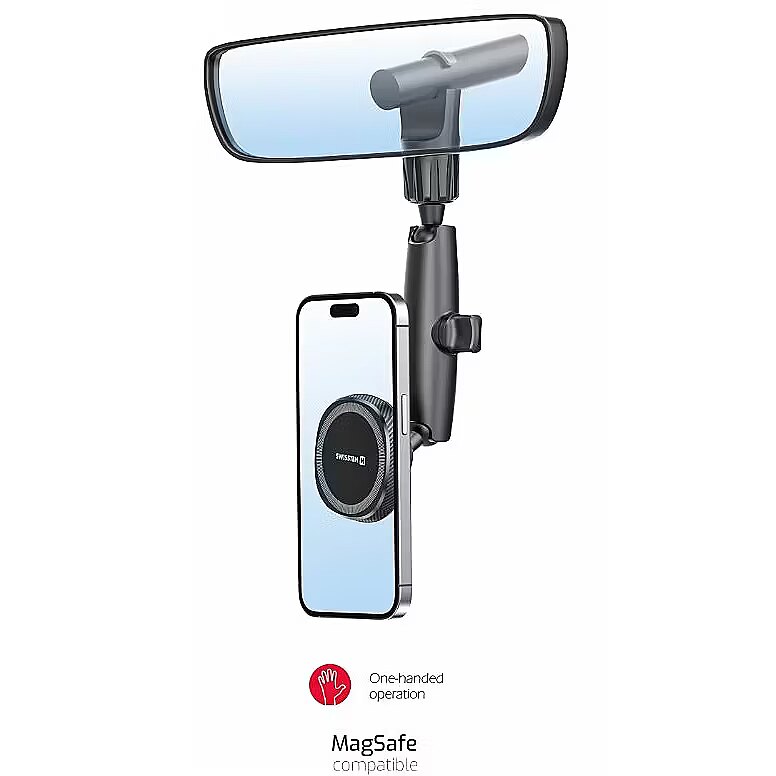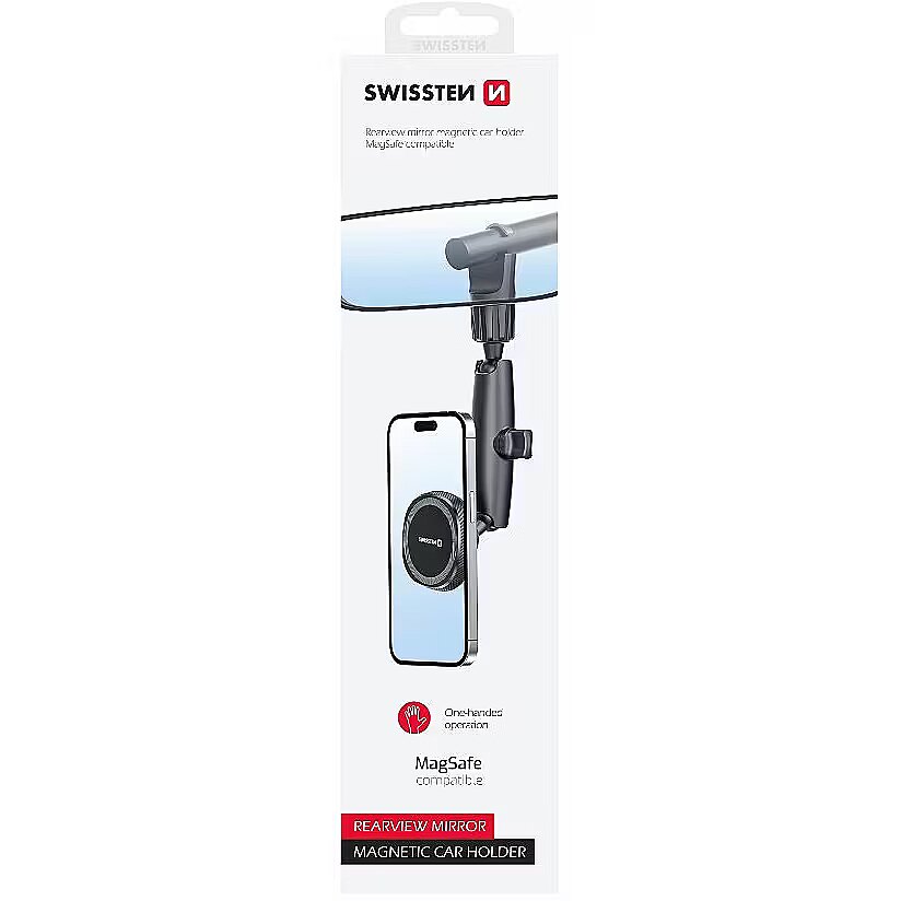description_en - SWISSTEN holder with Magsafe compatible attachment technology for mounting on rear view mirror. Packed in a SWISSTEN retail pack.Magsafe attachmentThanks to Magsafe technology, smartphones Iphone 13 and newer attach perfectly to the holder. For other smartphones (and other brands), an adhesive ring is included that sticks to the back of the smartphone or case.Positioning on the rear view mirrorThanks to the fastening mechanism, the holder can be attached to a bar with a diameter of 4.12-36.3mm and is therefore suitable for mounting on rear view mirrors.