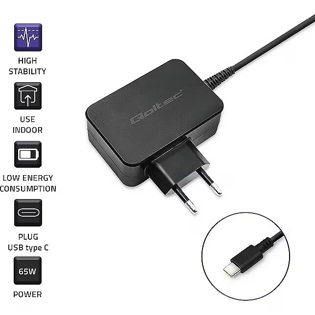 The Qoltec brand charger uses advanced POWER DELIVERY technology that adapts to the connected equipment, precisely setting the maximum voltage and current required. POWER DELIVERY technology uses the USB-C connector .