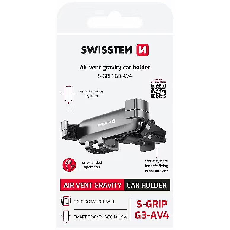 description_en - The elegant and durable aluminum holder features a gravity mechanism, which automatically secures your phone using its own weight. Simply place your phone in the holder, and the side arms will firmly grip it. Key Benefits of the SWISSTEN S-GRIP G3-AV4 Holder: