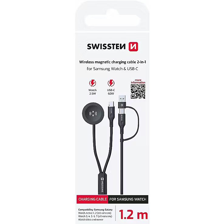 description_en - The SWISSTEN 2in1 magnetic cable is designed for fast and convenient charging of Samsung Galaxy Watch and USB-C devices. Thanks to the removable USB-A/USB-C adapter, it can be easily connected to a wide range of chargers and ports. When using USB-C, it delivers up to 60 W for phones, tablets, or laptops, and up to 2.5 W for the watch. The 1.2 m flexible silicone cable is durable, soft to the touch, and resistant to tangling. Dual charging