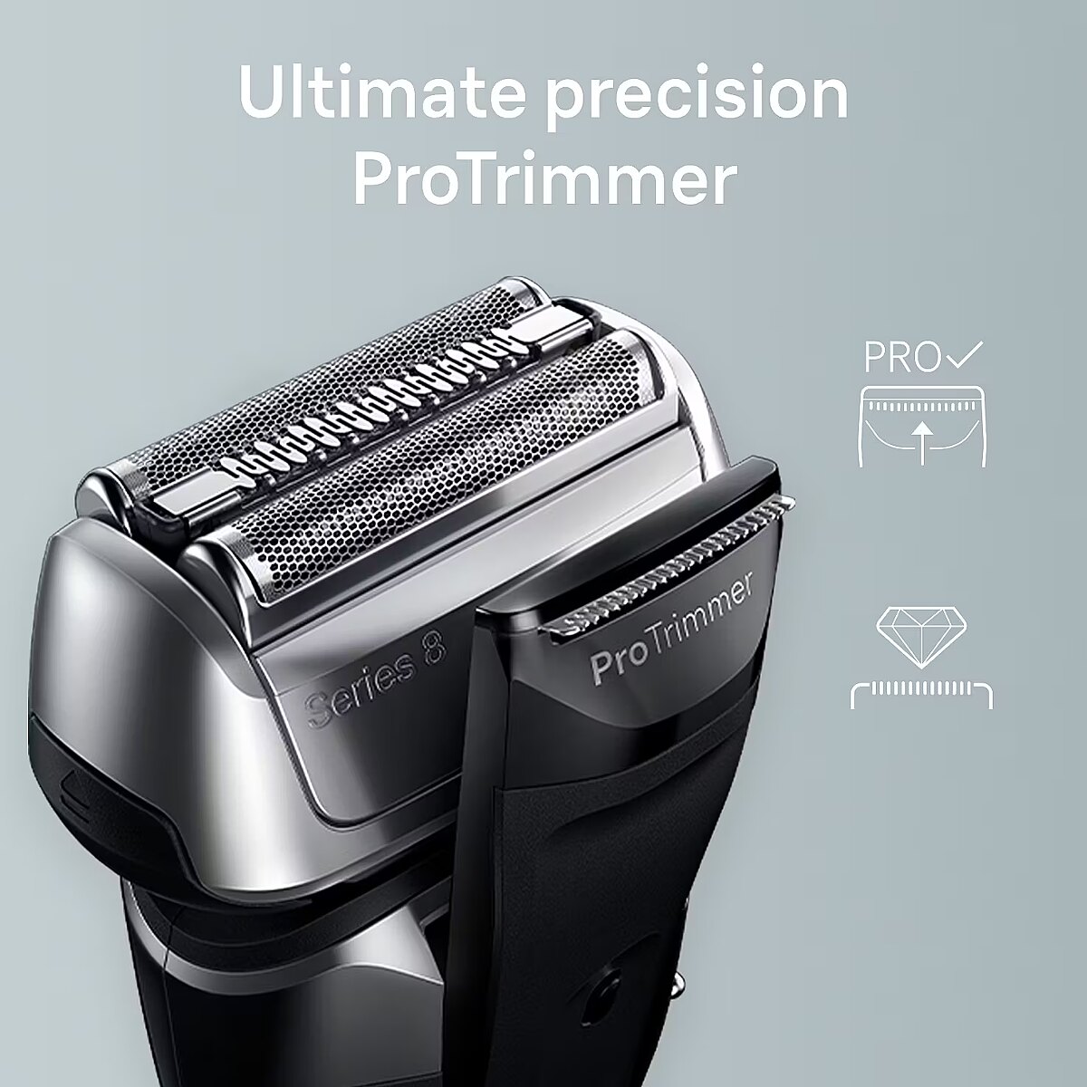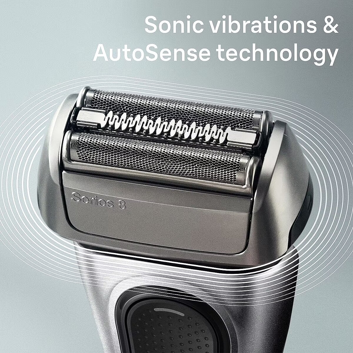 LongDesc - Superior close & gentle even on dense beardsRedesigned to upgrade your shave with superior closeness, skin comfort & precision.Ultimate precision even on longer hairsProTrimmer for maximum cutting efficiency even on sideburns, moustache and under nose.Efficient even on dense beards10,000 sonic vibrations & AutoSense technology shave the densest beards in fewer strokes.Closeness even in tricky areasUltra adaptive 40° shaving head adapts & reaches even the hardest-to-shave areas under the chin and neck.Built to last, every day, for years​100% Made in Germany and 100% waterproof. The Series 8 can be used dry, wet, or with foam.​Shave up to 4 weeks without rechargingThe powerful Li-Ion battery gives you up to 60 minutes of shaving time.​