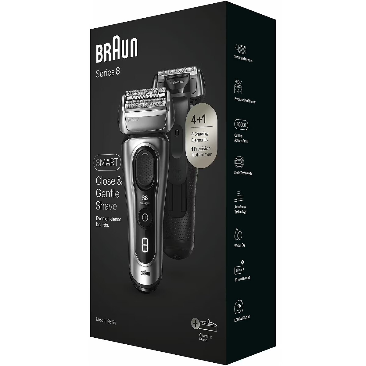LongSummaryDescription - Braun Series 8 8517s. Product colour: Silver, Control type: Buttons. Power source: Battery, Battery technology: Lithium-Ion (Li-Ion), Battery type: Built-in battery. Package type: Box. Quantity per pack: 1 pc(s), Shaver base station functions: Charging