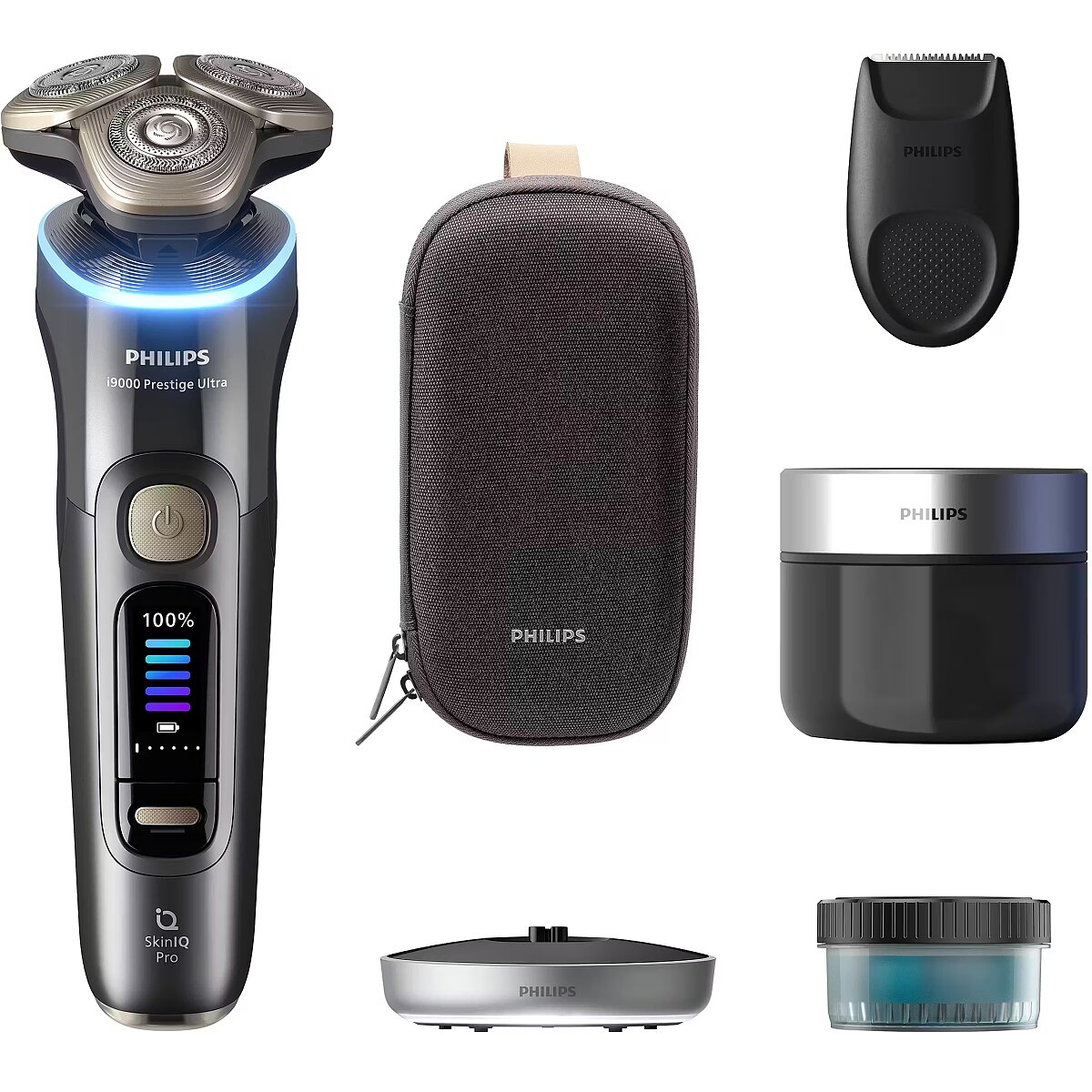LongSummaryDescription - Philips i9000 Prestige Ultra XP9402/31 Wet and Dry Electric Shaver with SkinIQ Pro. Shaver system: Rotation shaver, Product colour: Grey, Shaving system technologies: SkinIQ Pro. Power source: Battery, Battery technology: Lithium-Ion (Li-Ion), Battery type: Built-in battery. Shaver base station functions: Charging, Cleaning, Attachment combs: Beard