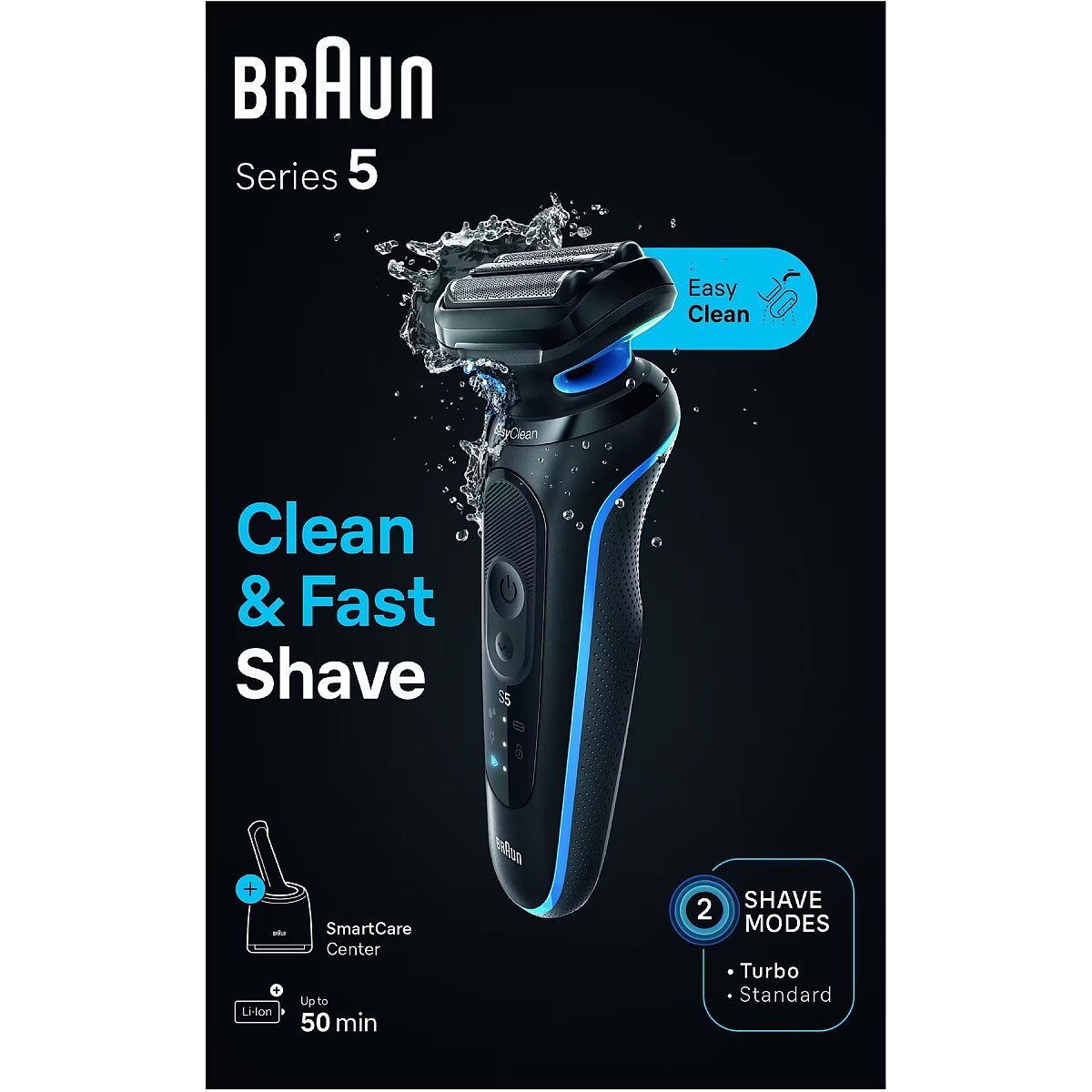 LongSummaryDescription - Braun Series 5 52-B7000cc. Shaver system: Foil shaver, Product colour: Black, Shaving system technologies: EasyClean. Power source: Battery, Battery technology: Lithium-Ion (Li-Ion), Battery type: Built-in battery. Width: 158 mm, Depth: 160 mm, Height: 250 mm. Package width: 265 mm, Package depth: 175 mm, Package height: 180 mm. Shaver base station functions: Charging, Cleaning, Lubricating