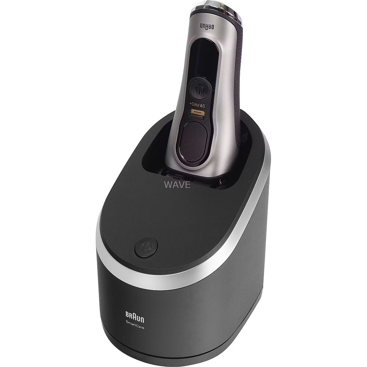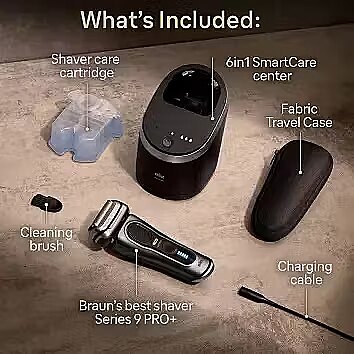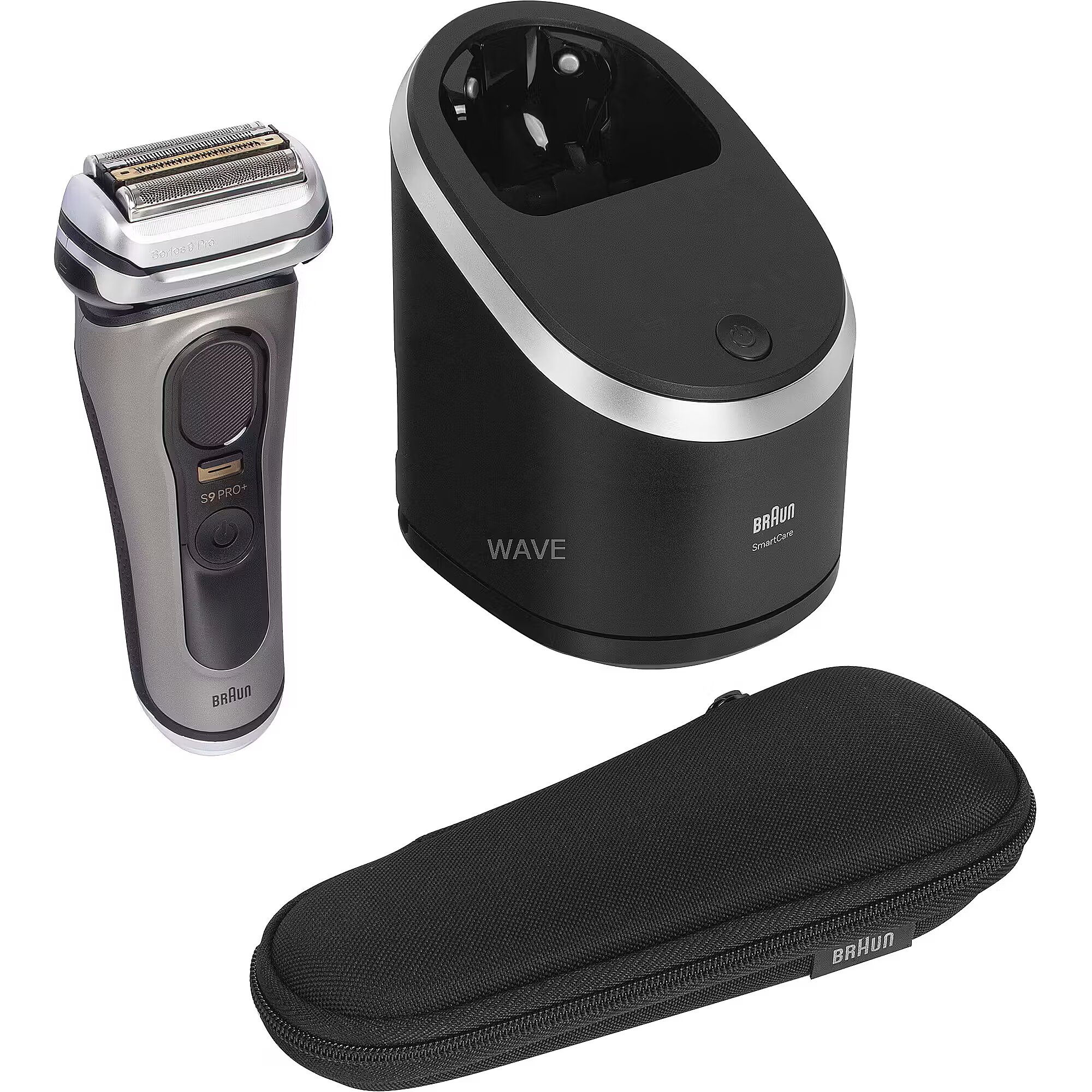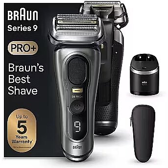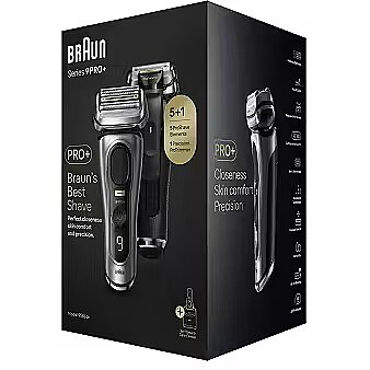 LongDesc - Braun’s best, better than ever before: Series 9 PRO+ redefines electric shaving to ensure ultimate closeness, skin comfort and precision.No matter 1, 3, or 7-day beard: 5 perfectly synchronized shaving elements deliver exceptional efficiency and skin comfort, even on the longest & trickiest hair in every stroke.Ultimate precision even on tricky hair: Built-in precision Pro Trimmer, enhanced with surgical-grade steel, gives maximum cutting efficiency even on moustache, sideburns and under nose.For a shaver like new, every day: 6-in-1 SmartCare Center cleans, dries, and charges your razor.Built to last for years: S9 PRO+ is 100% made in Germany. 100% waterproof. Powerful 60min Li-Ion battery runtime. Use wet or dry.