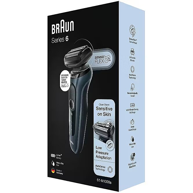LongSummaryDescription - Braun Series 6 61-N1000s. Shaver system: Foil shaver, Product colour: Black, Grey, Shaving system technologies: SensoFlex, SensoFoil. Power source: Battery, Battery technology: Lithium-Ion (Li-Ion), Battery type: Built-in battery. Package type: Box. Quantity per pack: 1 pc(s). Handle(s) features: Soft grip
