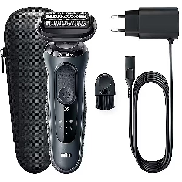 Technical_details - Type: Razor Colour: black/grey EAN: 4210201432920 Manufacturer No.: 61-N1000s Series: Series 6 Power supply: built-in rechargeable battery : Yes : 100 - 240V : Li-Ion : 50 minutes : 1 hour : 5 minutes Use: shaving Application: Wet, Dry Shaving/Cutting System: 3 flexible shaving elements, SensoFoil blades Shaving head: Movable shaving head, contour adjustment : SensoFlex head Display: LED display (battery status, cleaning status, replacement indicator, travel lock status) Cleaning: Fully washable Storage: travel case Notes: Non-slip handle for safe handling Feature: Wet&Dry technology Accessories: 1x travel case, 1x power adapter with automatic adjustment to 100V to 240V, 1x cleaning brush