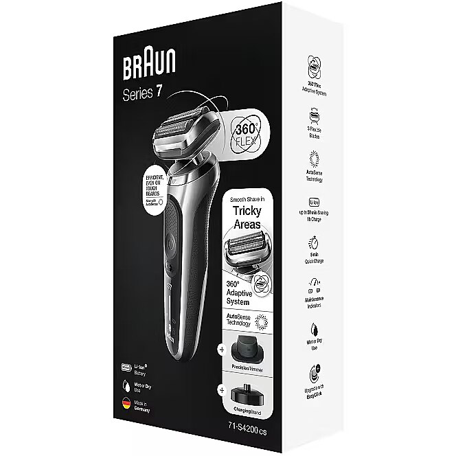 LongSummaryDescription - Braun Series 7 71-S4200cs. Shaver system: Foil shaver, Product colour: Black, Shaving system technologies: AutoSense. Power source: Battery, Battery technology: Lithium-Ion (Li-Ion), Battery type: Built-in battery. Package type: Box. Shaver base station functions: Charging, Cleaning