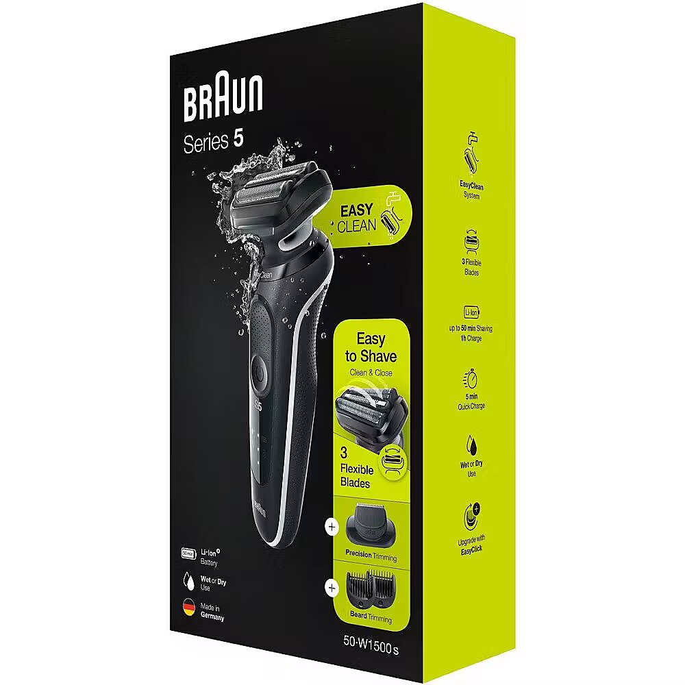 LongSummaryDescription - Braun Series 5 51-W1500s. Shaver system: Foil shaver, Product colour: Black, Blade material: Stainless steel. Power source: Battery, Battery technology: Lithium-Ion (Li-Ion), Battery type: Built-in battery. Attachment combs: Beard, Head