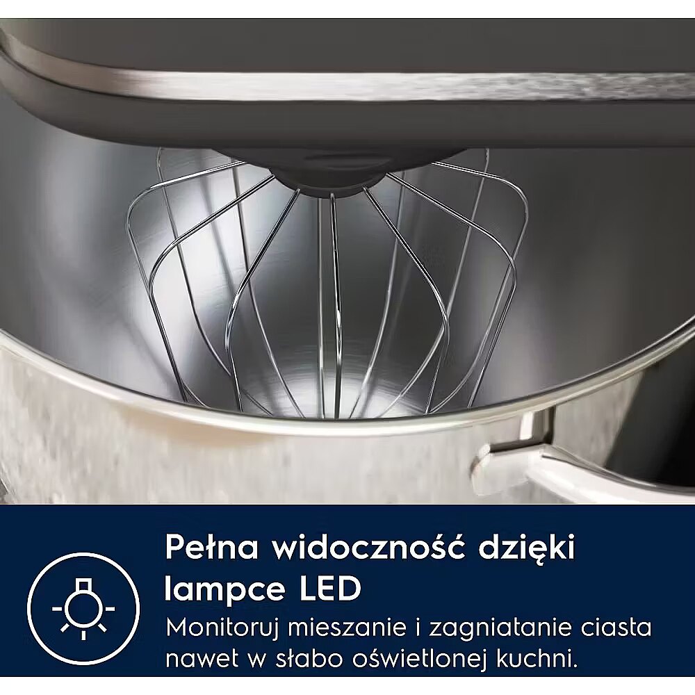 Funkcjonalna lampa LED wbudowana w urządzenie Kitchen Machine umożliwia łatwe monitorowanie mieszania i ugniatania, nawet przy słabym świetle w kuchni.