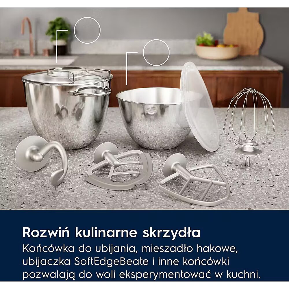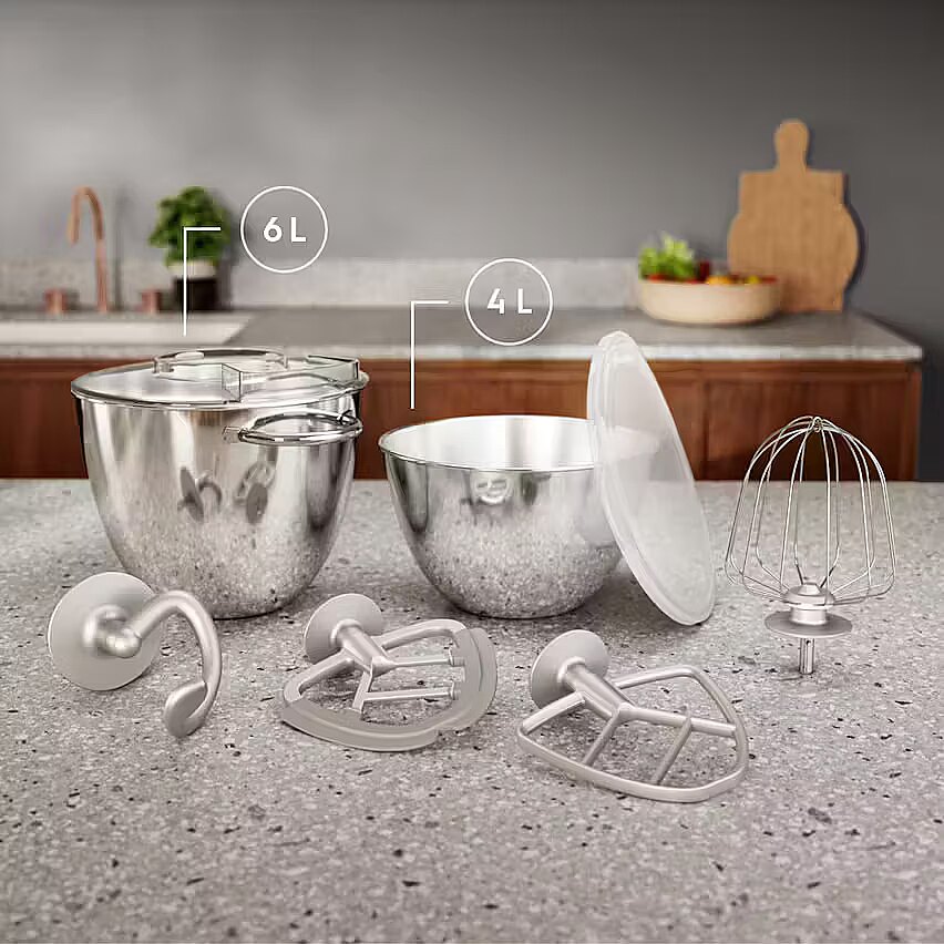 Accessories included - Misa 6l Misa 4l Pokrywa Hak do ugniatania ciężkiego ciasta Trzepaczka do lukru i bezy Ubijaczka SoftEdgeBeater z wbudowaną silikonową szpatułką