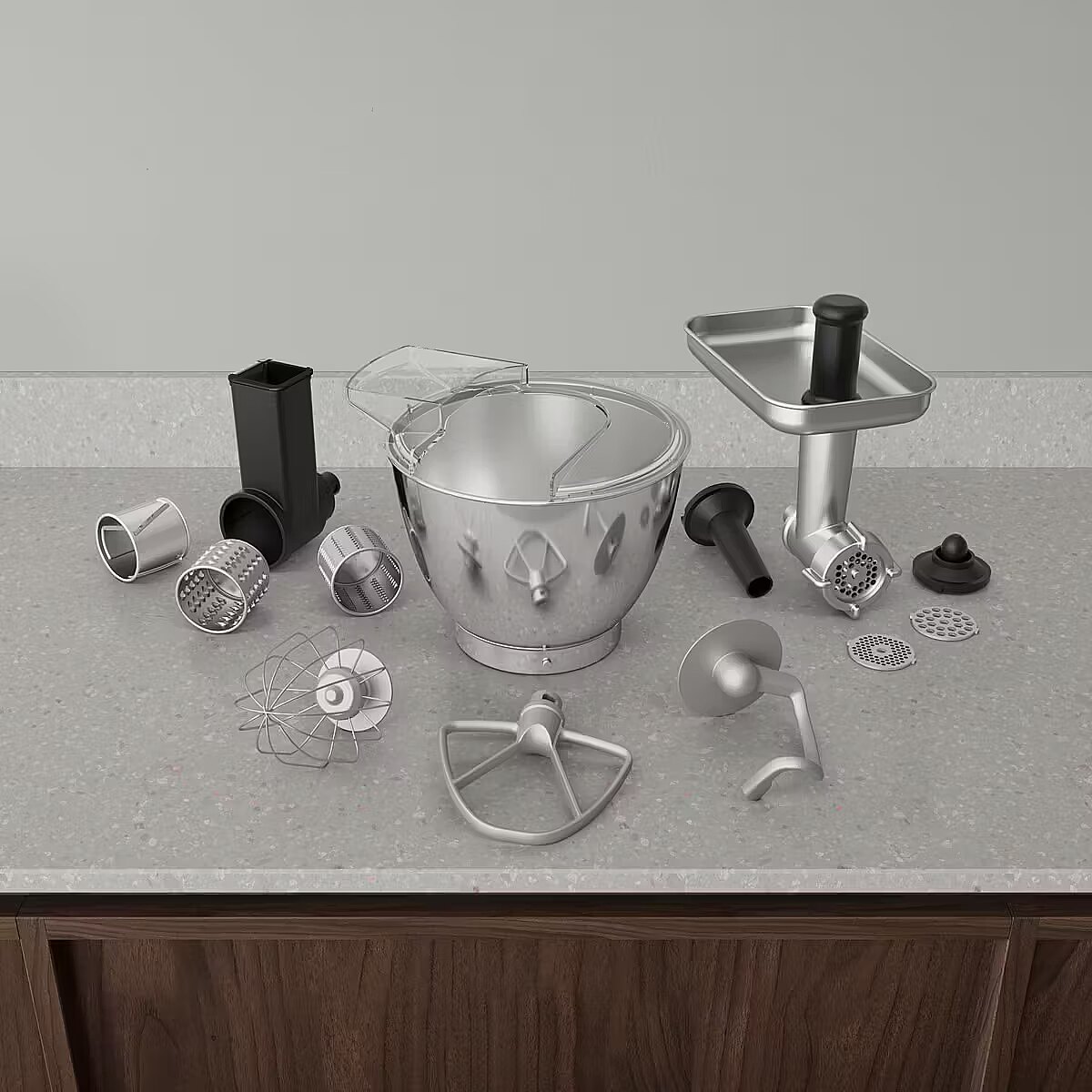 Complete : Cover against splashes, Meat press, Mixing spoon