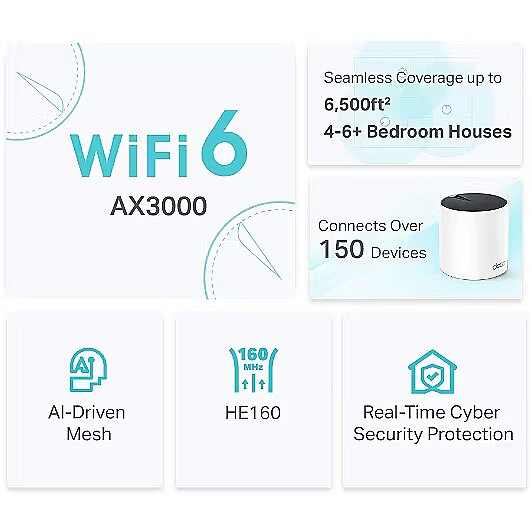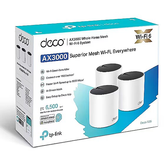 LongDesc - Superior Mesh WiFi, EverywhereAX3000 Whole Home Mesh WiFi 6 SystemUltra-Fast WiFi 6 MeshArmed with WiFi 6 technology, Deco whole home mesh WiFi is designed to deliver a huge boost in coverage, speed, and total capacity. Get on the latest mesh WiFi to enjoy the future network that loads faster and connects more.Up to 4x More Capacity for Immersive StreamingEnhanced by WiFi 6, featuring with OFDMA and MU-MIMO technology, Deco X55 allows you to connect over 150 devices. Enjoy a more efficient network that loads faster without dragging down performance.Whole-Home Coverage: WiFi Dead Zone KillerWith clearer and stronger signals enhanced by BSS Color and Beamforming, Deco X55 boosts broader whole home WiFi coverage with great performance. Wireless connections and optional Ethernet backhaul work together to link Deco units, providing even faster network speeds and truly seamless coverage. Want more coverage? Simply add another Deco.AI-Driven Mesh: Always Learning, Constantly OptimizingArmed with AI-Driven Mesh, Deco X55 delivers smart WiFi that follows you wherever you are, without interruption. It automatically learns your network environment, client quality, and user behaviors. Sophisticated algorithms account for various factors so that Deco X55 provides ideal mesh WiFi, unique to your home. Walk through your home and enjoy seamless streaming at the fastest possible speeds.Seamless Roaming with One WiFi NameTP-Link Mesh means Deco units work together to form one unified network. Your phone or tablet automatically connects to the fastest Deco as you move through your home, creating a truly seamless WiFi experience.Let the Experts Secure Your HomeCustomize your home network with enhanced security using TP-Link HomeShield's kit of built-in features. Whether you're identifying network security holes, limiting the time your children spend online, or blocking websites, HomeShield gives you the tools you need to fully manage your network.Quick Setup with the Deco AppUnbox Deco, install the app and then simply follow the on-screen directions. Deco app will take care of the rest, getting your network up and running in minutes.Easy ManagementManage your WiFi at home or away on the Deco app, including seeing all connected devices, prioritizing your own, setting up a guest network, and more.Voice ControlPair with Alexa to control Deco X55 with simple voice commands. Enjoy the convenient life.All Decos Work TogetherDeco X55 is compatible with every other Deco model to form a mesh network. Expand mesh WiFi coverage anytime by simply adding more Decos.More than a Router, Functional and BeautifulThe pure white × black design, simple but all-embracing, evokes a wintery mood or a bright summer day. Deco X55 with a delicate body case makes it perfect to blend into various home decorations.