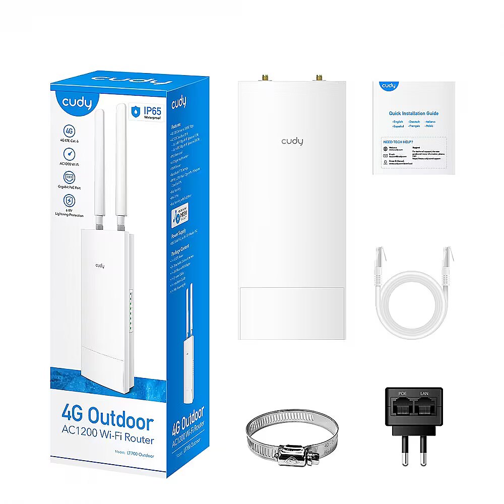 Accessories included - 2 x detachable 4G antenna Passive PoE adapter Accessories for pole installation Ethernet cable Quick Installation Guide