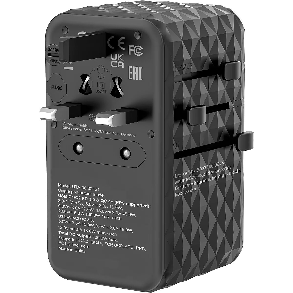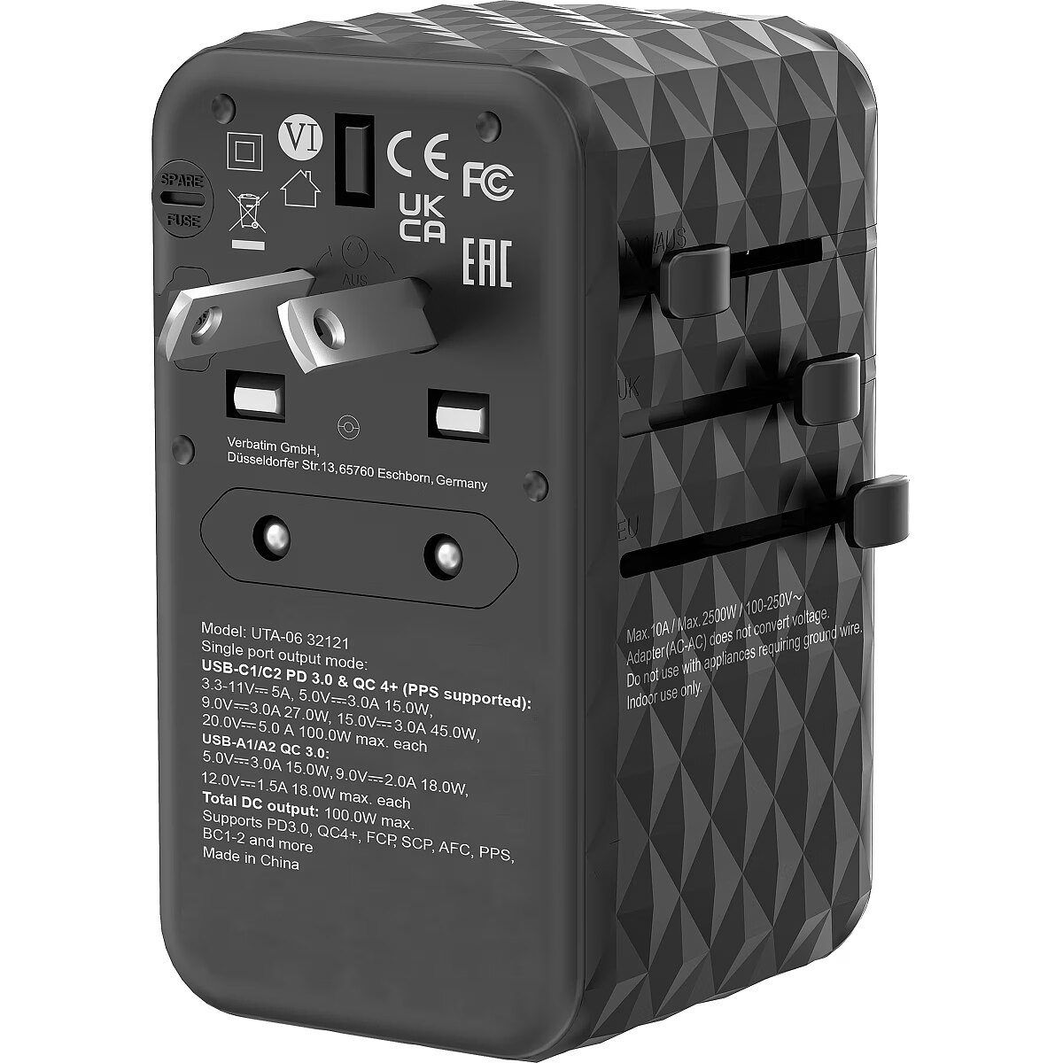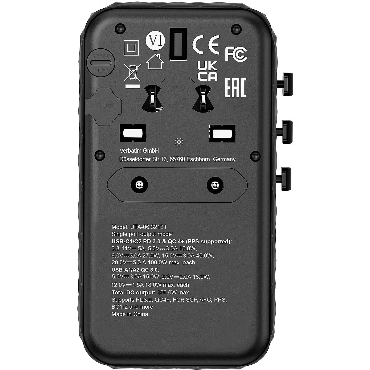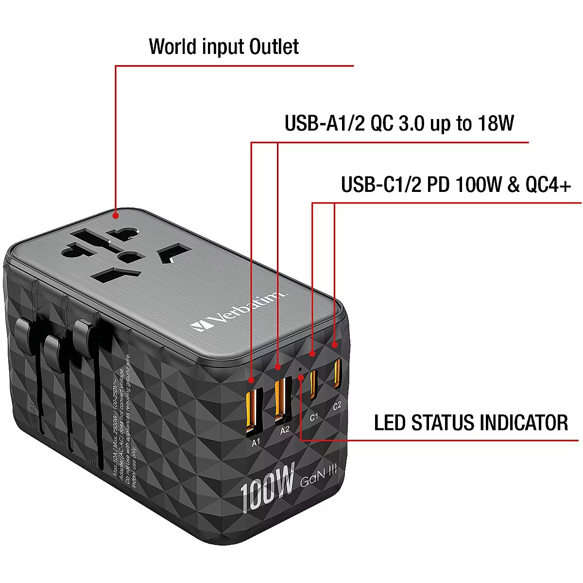 LongDesc - Worldwide Travel AdapterThe Verbatim GaN III Universal Travel Adapter can be used in more than 180 countries – take it everywhere with you and never be out of power. This world-to-world multi plug will allow you to connect to any local power supply around the world and recharge your power-hungry devices, like laptops, smartphones, Bluetooth speakers, tablets, power banks, and more. Just push the sliders on the side of the multi plug to reveal the three most common international plugs - EU, UK, and US - and rotate the pins for sockets in Australia or China.The Verbatim Travel Adapter uses latest GaN technology, a semiconductor material that can efficiently handle high voltage and high-frequency applications. It enables devices to be smaller, lighter, and more efficient compared to products using traditional silicon-based components.Superfast 5-in-1 charging, up to 100WThe compact and powerful Verbatim GaN III Universal Travel Adapter allows five devices to be charged simultaneously through the AC power socket and the two USB-C and two USB-A ports.The two USB-C ports support Power Delivery 3.0 (with PPS support) and Quick Charge 4+ output, up to 100W each, and the two USB-A ports support Quick Charge 3.0 output, up to 18W.Stylish, Compact and SafeHoused in an attractive black 3D design, the Universal Adapter is made with high quality fireproof polycarbonate material and is certified by CE, UKCA, FCC and ROHS.It has safety shutters for child protection that can only be opened with force of more than 75N (7.5Kg) per hole, and its BS1362 compliant fuse (including a spare) gives you 100% peace of mind wherever you may go.