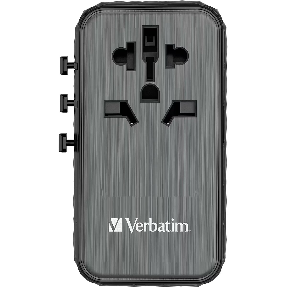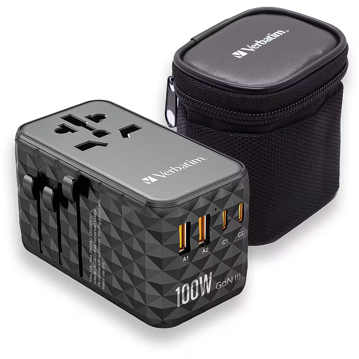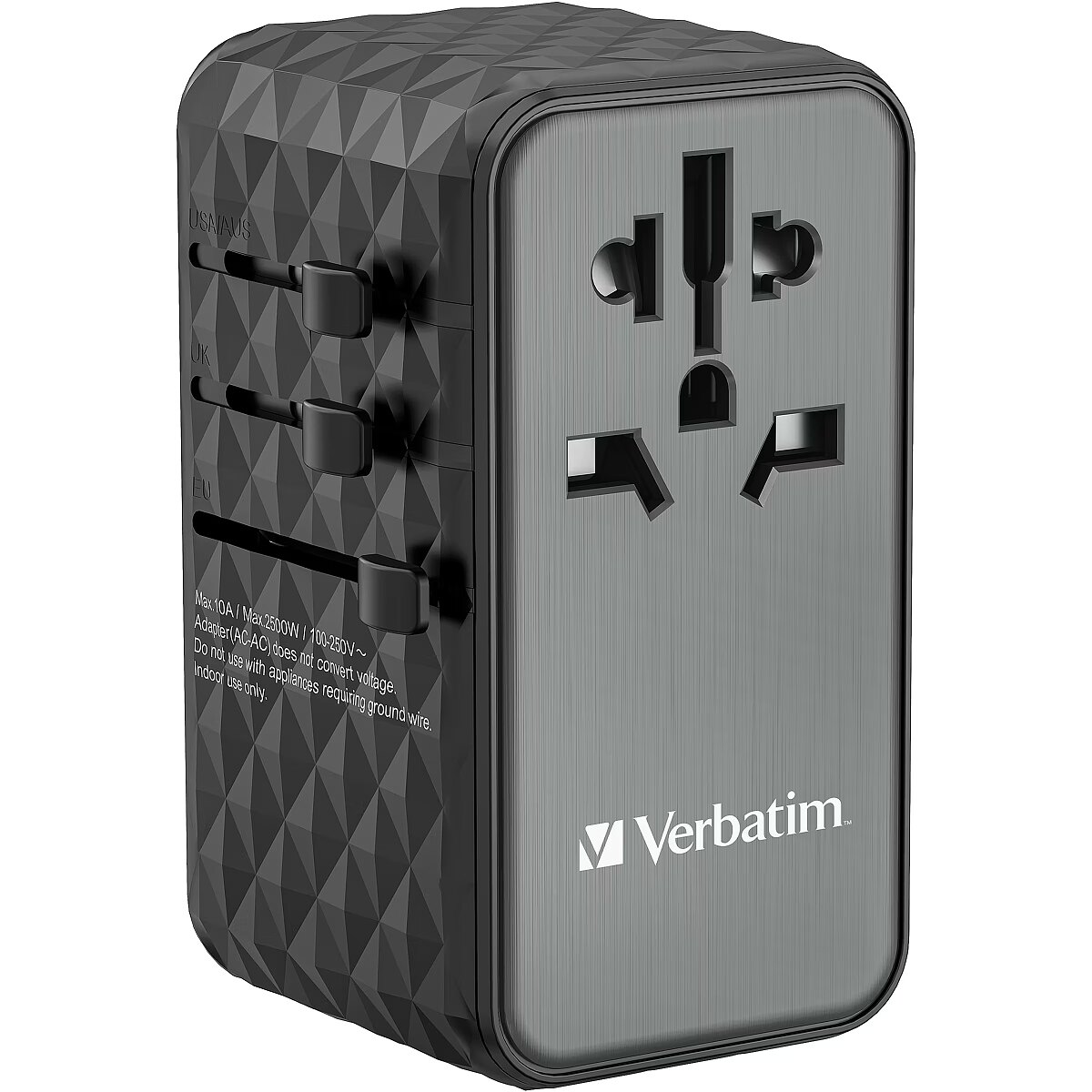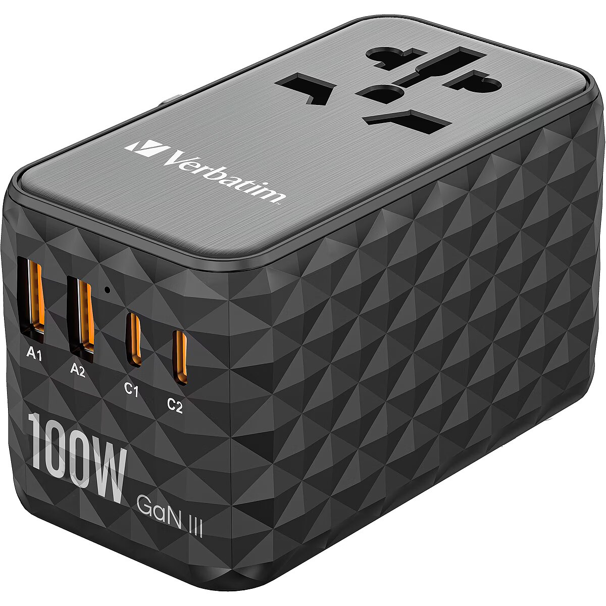 LongDesc - Worldwide Travel AdapterThe Verbatim GaN III Universal Travel Adapter can be used in more than 180 countries – take it everywhere with you and never be out of power. This world-to-world multi plug will allow you to connect to any local power supply around the world and recharge your power-hungry devices, like laptops, smartphones, Bluetooth speakers, tablets, power banks, and more. Just push the sliders on the side of the multi plug to reveal the three most common international plugs - EU, UK, and US - and rotate the pins for sockets in Australia or China.The Verbatim Travel Adapter uses latest GaN technology, a semiconductor material that can efficiently handle high voltage and high-frequency applications. It enables devices to be smaller, lighter, and more efficient compared to products using traditional silicon-based components.Superfast 5-in-1 charging, up to 100WThe compact and powerful Verbatim GaN III Universal Travel Adapter allows five devices to be charged simultaneously through the AC power socket and the two USB-C and two USB-A ports.The two USB-C ports support Power Delivery 3.0 (with PPS support) and Quick Charge 4+ output, up to 100W each, and the two USB-A ports support Quick Charge 3.0 output, up to 18W.Stylish, Compact and SafeHoused in an attractive black 3D design, the Universal Adapter is made with high quality fireproof polycarbonate material and is certified by CE, UKCA, FCC and ROHS.It has safety shutters for child protection that can only be opened with force of more than 75N (7.5Kg) per hole, and its BS1362 compliant fuse (including a spare) gives you 100% peace of mind wherever you may go.