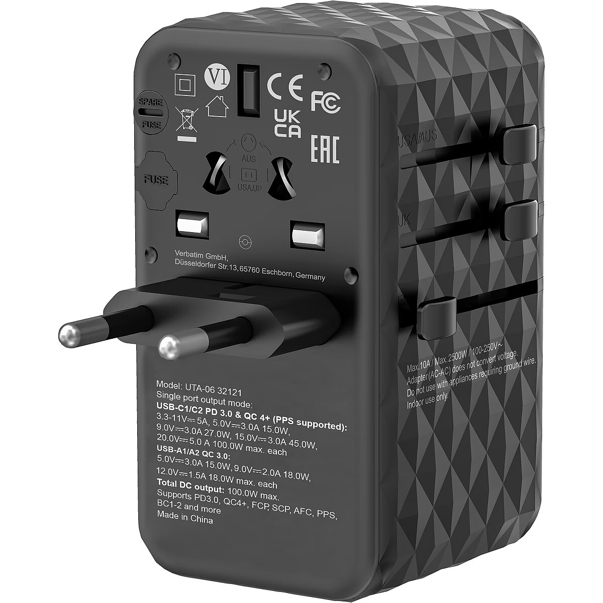 ShortSummaryDescription - Verbatim UTA-06 100W GaN III Universal Travel Adapter with 2 x USB-C PD & QC 4+ & 2 x USB-A QC 3.0 ports, Indoor, Black