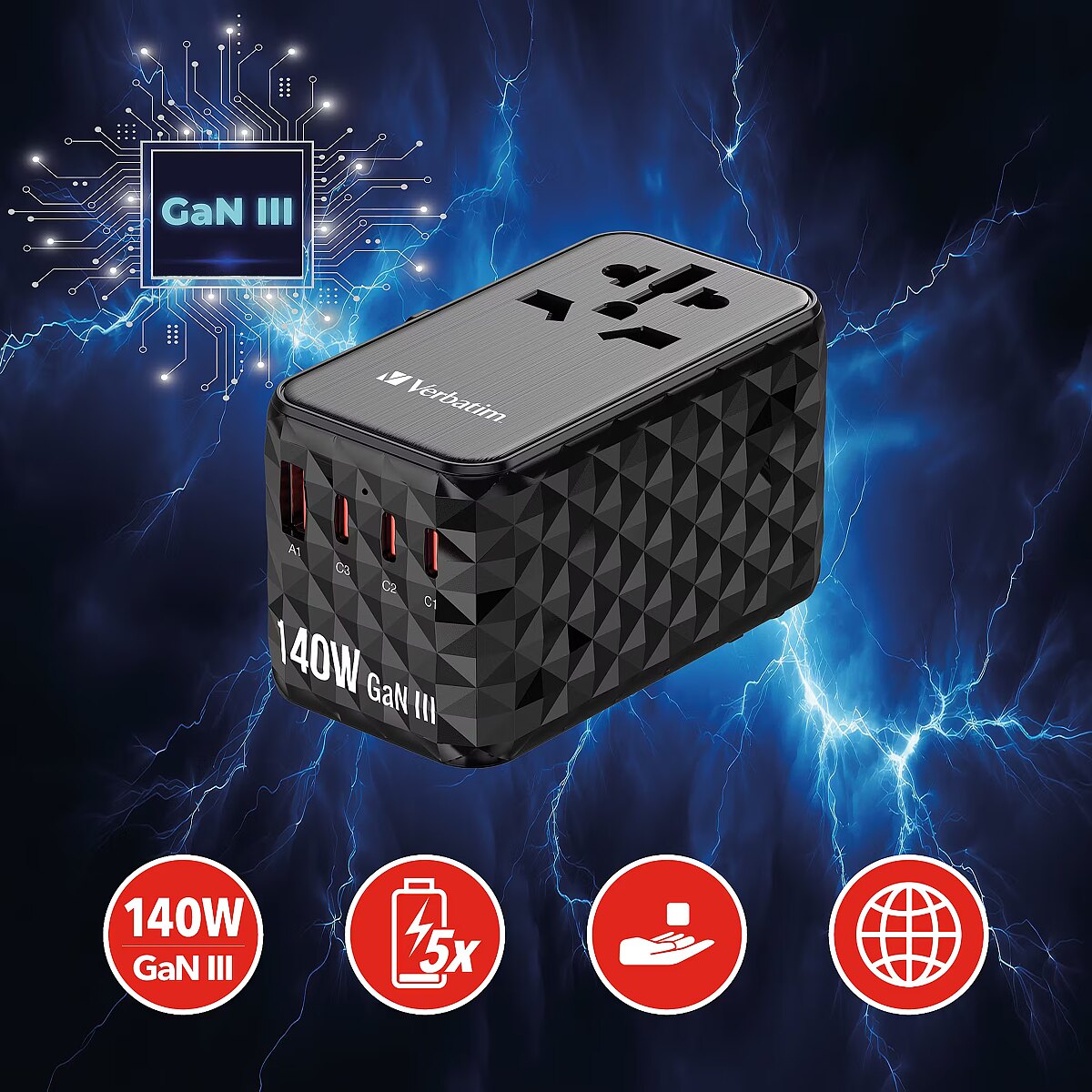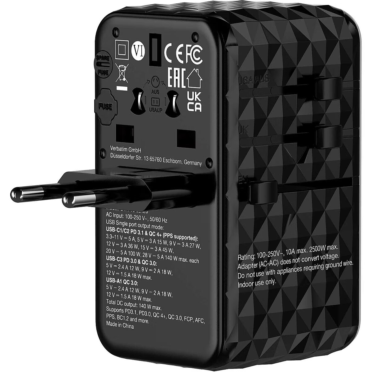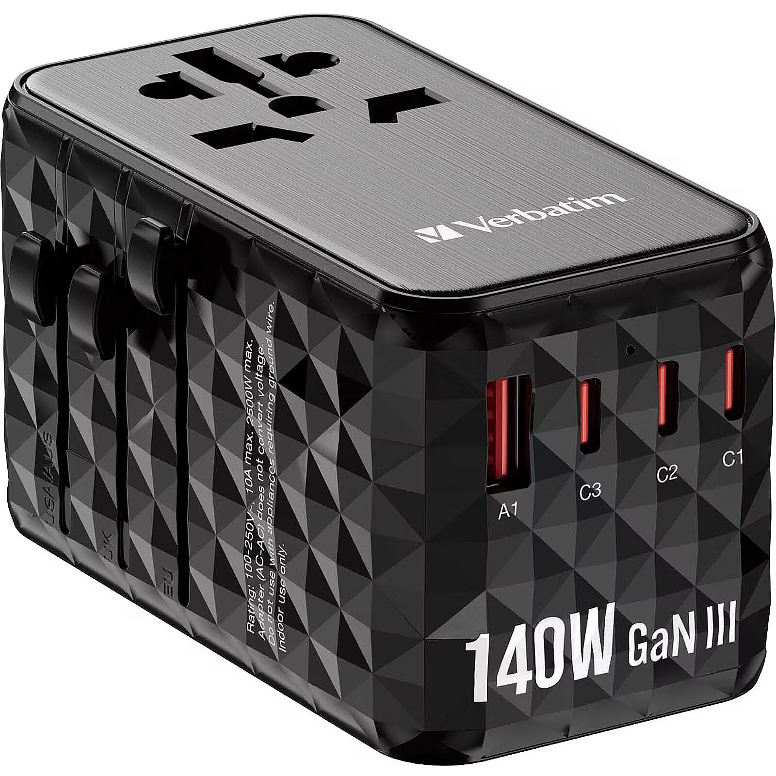 LongDesc - Worldwide Travel AdapterThe Verbatim GaN III Universal Travel Adapter can be used in more than 180 countries – take it everywhere with you and never be out of power. This world-to-world multi plug will allow you to connect to any local power supply around the world and recharge your power-hungry devices, like laptops, smartphones, Bluetooth speakers, tablets, power banks, and more. Just push the sliders on the side of the multi plug to reveal the three most common international plugs - EU, UK, and US - and rotate the pins for sockets in Australia or China.The Verbatim Travel Adapter uses latest GaN technology, a semiconductor material that can efficiently handle high voltage and high-frequency applications. It enables devices to be smaller, lighter, and more efficient compared to products using traditional silicon-based components.Superfast 5-in-1 chargingThe compact and powerful Verbatim GaN III Universal Travel Adapter allows five devices to be charged simultaneously through the AC power socket and the three USB-C and single USB-A ports.All four USB ports deliver ultra-fast charging. Two USB-C ports support Power Delivery 3.1 (with PPS support) and Quick Charge 4+ output, up to 140W each, a third USB-C port supports Power Delivery 3.0 and Quick Charge 3 output, up to 18W and the single USB-A port supports Quick Charge 3.0 output, up to 18W.Stylish, Compact and SafeHoused in an attractive black 3D design, the Universal Adapter is made with high quality fireproof polycarbonate material and is certified by CE, UKCA, FCC and ROHS.It has safety shutters for child protection that can only be opened with force of more than 75N (7.5Kg) per hole, and its BS1362 compliant fuse (including a spare) gives you 100% peace of mind wherever you may go.