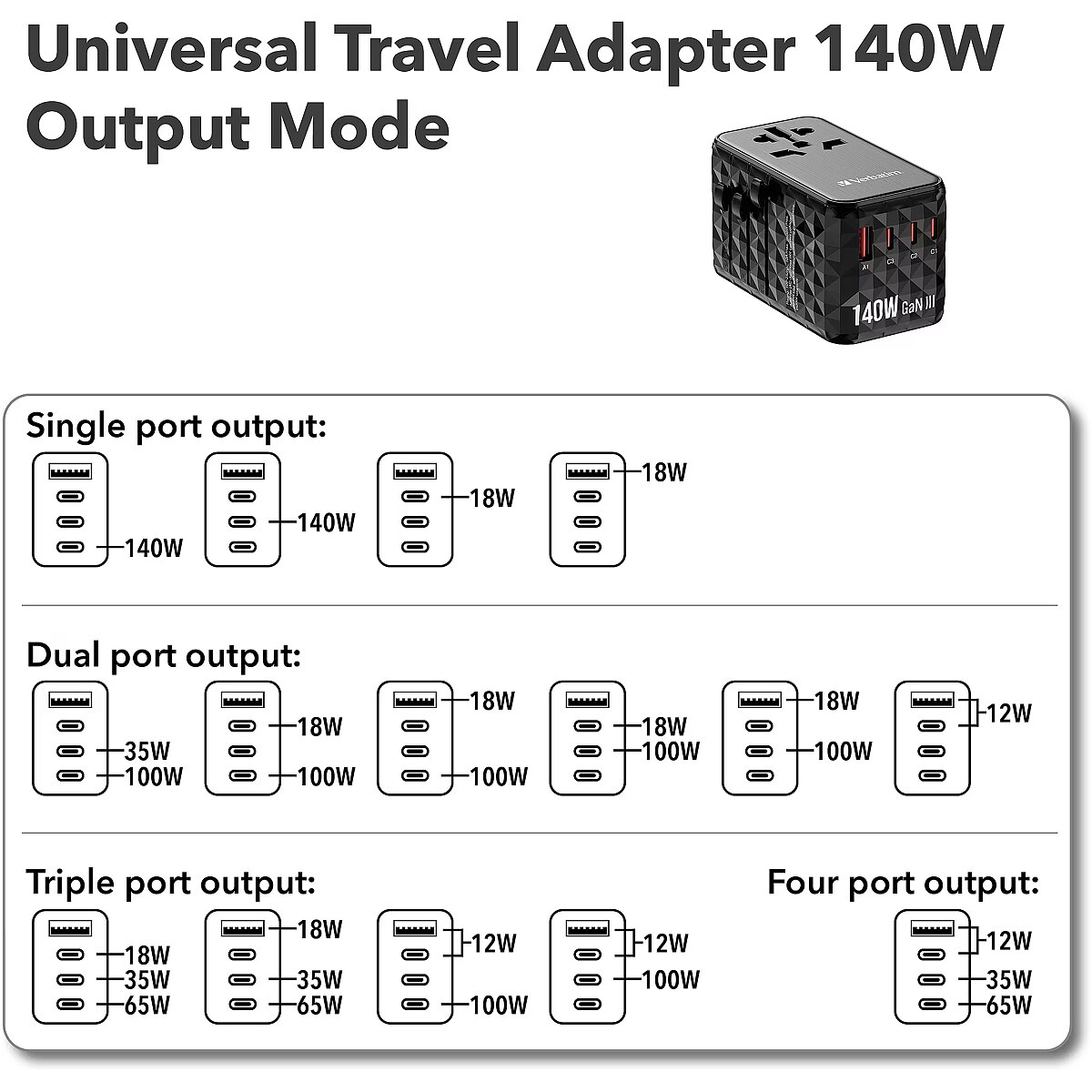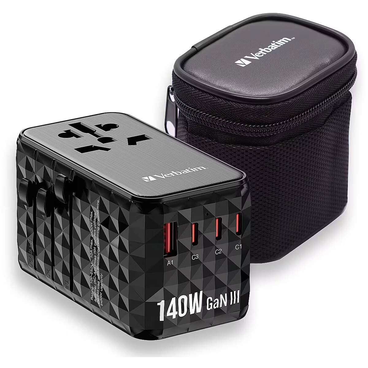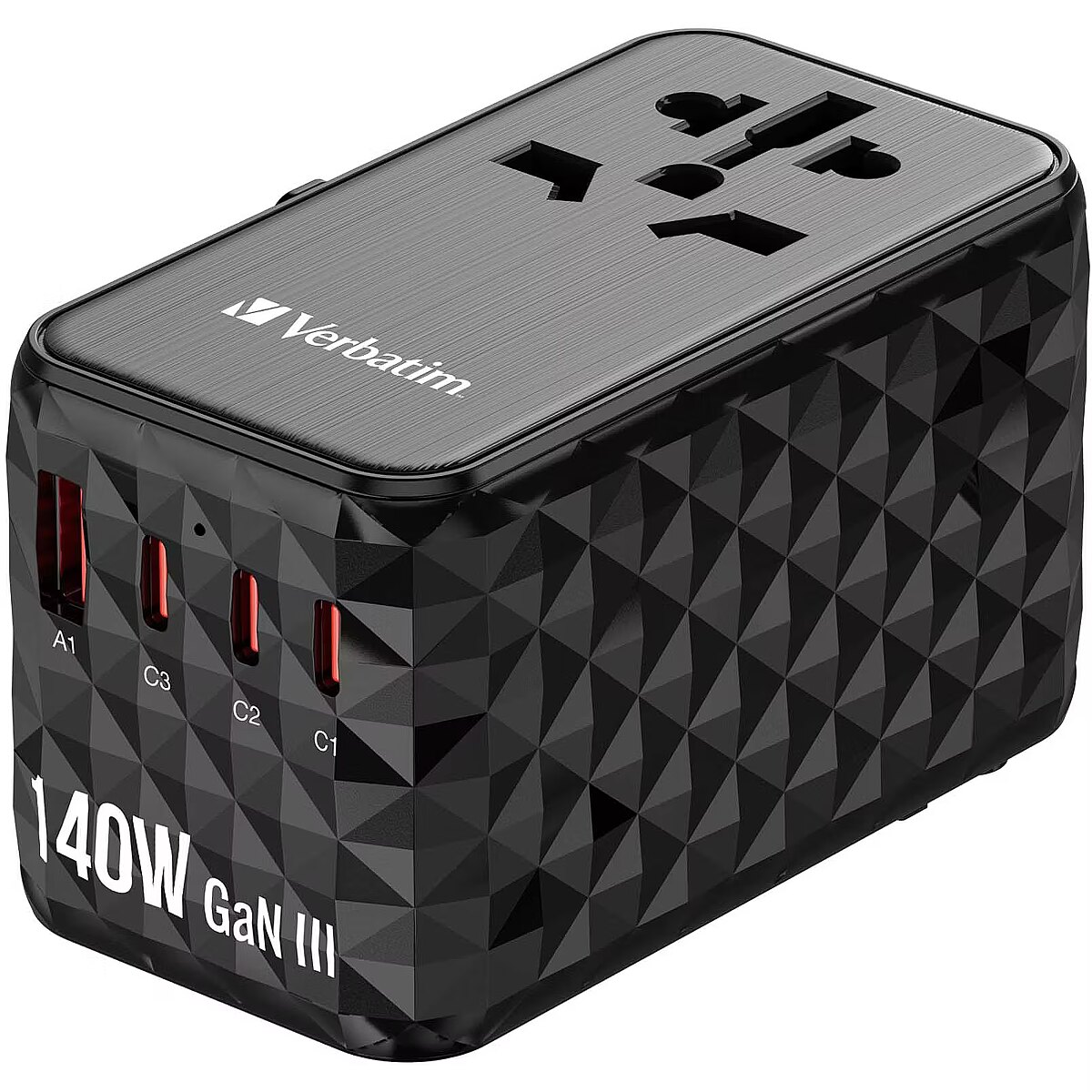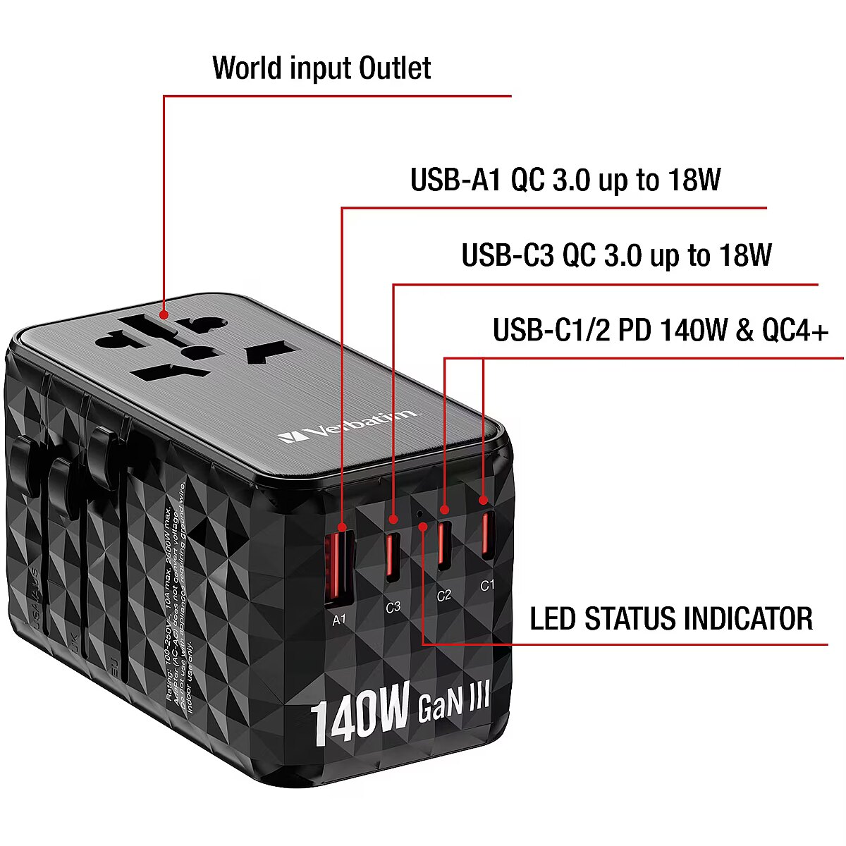 LongDesc - Worldwide Travel AdapterThe Verbatim GaN III Universal Travel Adapter can be used in more than 180 countries – take it everywhere with you and never be out of power. This world-to-world multi plug will allow you to connect to any local power supply around the world and recharge your power-hungry devices, like laptops, smartphones, Bluetooth speakers, tablets, power banks, and more. Just push the sliders on the side of the multi plug to reveal the three most common international plugs - EU, UK, and US - and rotate the pins for sockets in Australia or China.The Verbatim Travel Adapter uses latest GaN technology, a semiconductor material that can efficiently handle high voltage and high-frequency applications. It enables devices to be smaller, lighter, and more efficient compared to products using traditional silicon-based components.Superfast 5-in-1 chargingThe compact and powerful Verbatim GaN III Universal Travel Adapter allows five devices to be charged simultaneously through the AC power socket and the three USB-C and single USB-A ports.All four USB ports deliver ultra-fast charging. Two USB-C ports support Power Delivery 3.1 (with PPS support) and Quick Charge 4+ output, up to 140W each, a third USB-C port supports Power Delivery 3.0 and Quick Charge 3 output, up to 18W and the single USB-A port supports Quick Charge 3.0 output, up to 18W.Stylish, Compact and SafeHoused in an attractive black 3D design, the Universal Adapter is made with high quality fireproof polycarbonate material and is certified by CE, UKCA, FCC and ROHS.It has safety shutters for child protection that can only be opened with force of more than 75N (7.5Kg) per hole, and its BS1362 compliant fuse (including a spare) gives you 100% peace of mind wherever you may go.