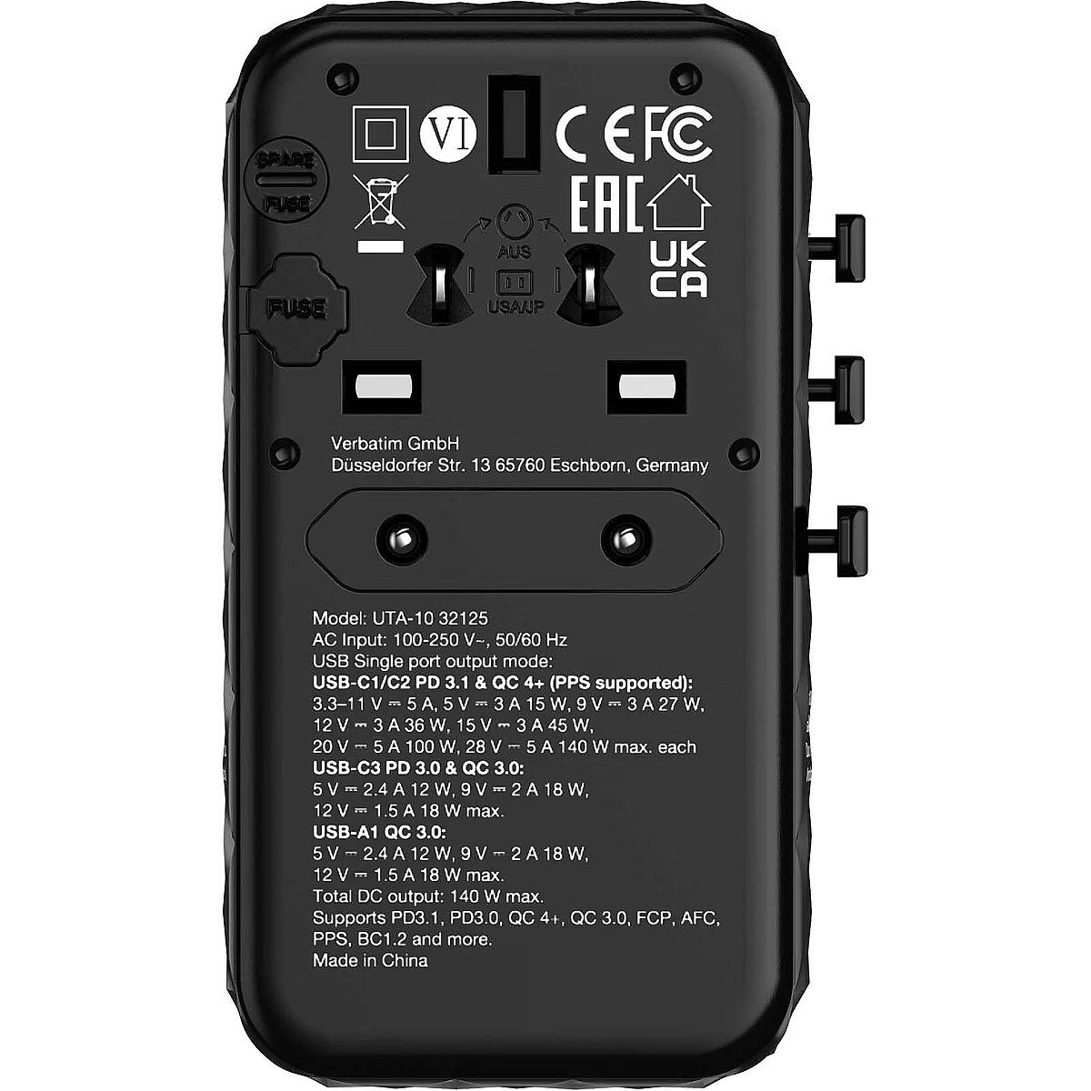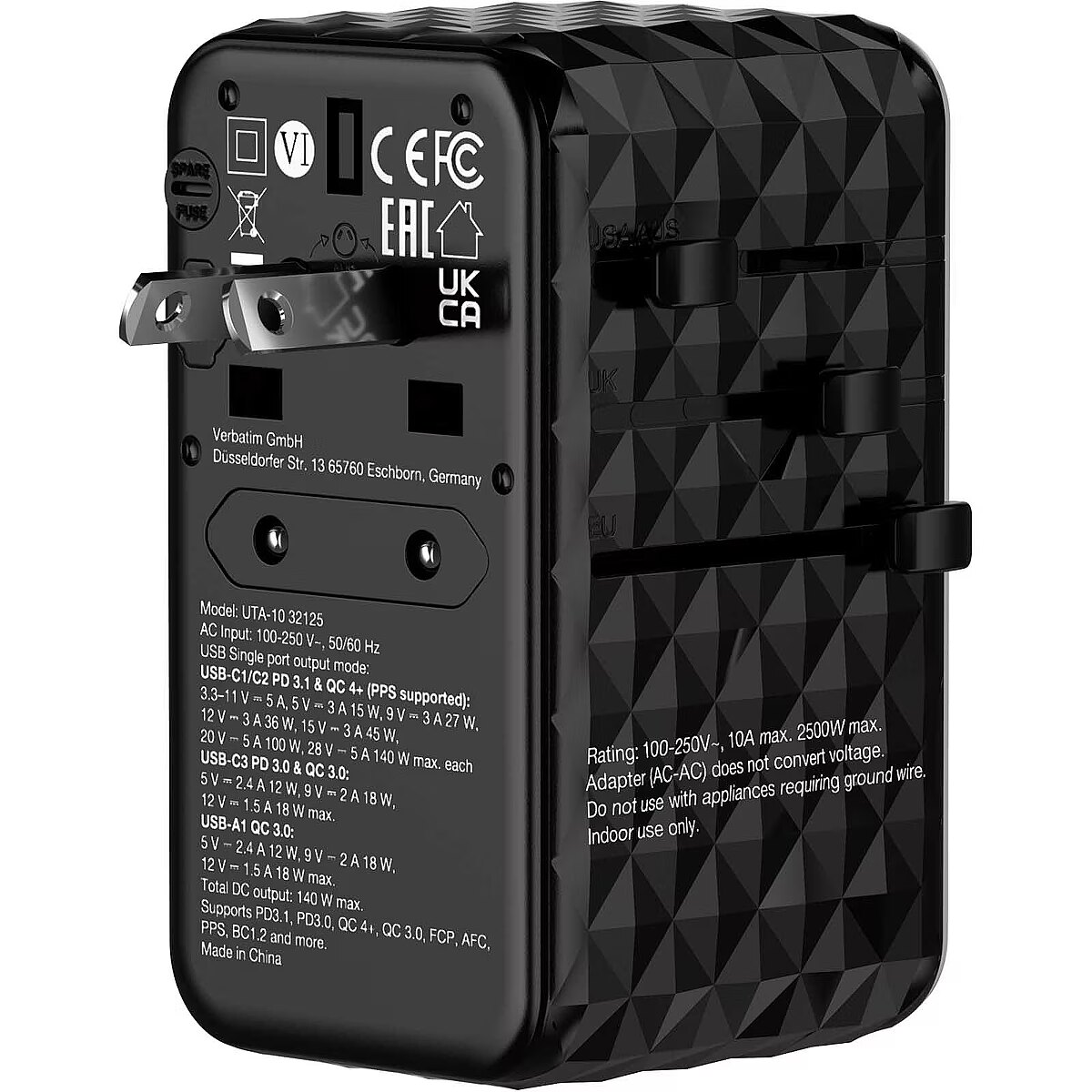 ShortSummaryDescription - Verbatim UTA-10 140W GaN III Universal Travel Adapter with 2 x USB-C PD 3.1 & QC 4+, 1 x USB-C PD 3.0 & 1 x USB-A QC 3.0 ports, Indoor, AC, Black