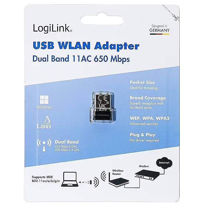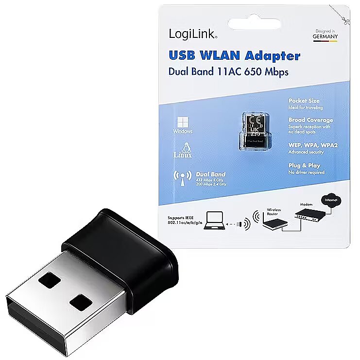 Description - Wireless USB WLAN adapter, 11ac, 650 Mbit The WL0252 Wireless 11ac Dual Band USB Adapter from LogiLink is an ultra-small Wi-Fi dongle, perfect for smooth HD streaming, gaming, and social networking. Its Dual Band technology enables simultaneous connections of up to 433 Mbit/s on the 5 GHz band and 200 Mbit/s on the 2.4 GHz band. With Plug and Play functionality, no driver is required. It supports common operating systems including Windows, Linux, and Mac OS and offers advanced security features like WPA2-PSK (TKIP/AES) encryption.