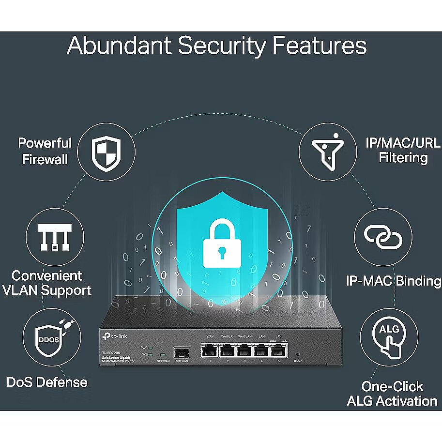 Description - Integrated into Omada SDN: Zero-Touch Provisioning (ZTP)**, Centralized Cloud Management, and Intelligent Monitoring. Centralized Management: Cloud access and Omada app for ultra convenience and easy management. Gigabit Ports: 1 gigabit SFP and 5 gigabit RJ45 ports provide high-speed wired connectivity. Up to 4 WAN Ports: 1 gigabit SFP WAN port, 1 gigabit RJ45 WAN port, 2 gigabit WAN/LAN ports optimize bandwidth usage. Highly Secure VPN: Supports up to 100× LAN-to-LAN IPsec, 50× OpenVPN*, 50× L2TP, and 50× PPTP VPN connections. Abundant Security Features: Advanced firewall policies, DoS defense,IP/MAC/URL filtering, and more security functions protect your network and data.