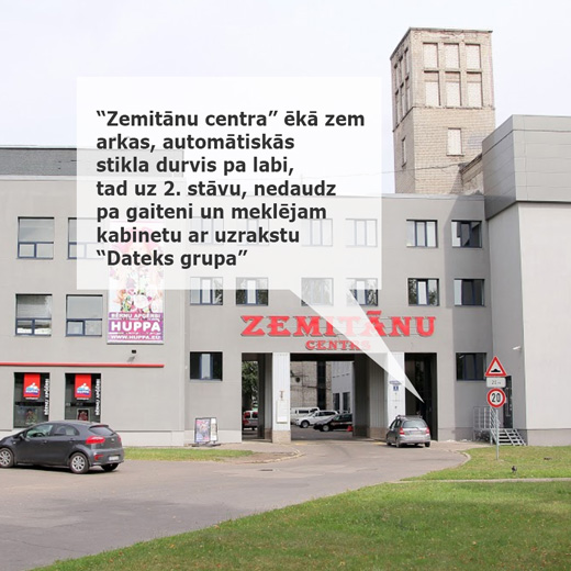 Dateks.lv birojs atrodas Zemitāna ielā 9 k-1, un ir viegli sasniedzams gan ar sabiedrisko transportu, gan automašīnu. Biroja teritorijā bez maksas atļauts auto novietot uz 1 stundu, kas ir pilnīgi pietiekoši konsultācijai vai pasūtījuma saņemšanai.