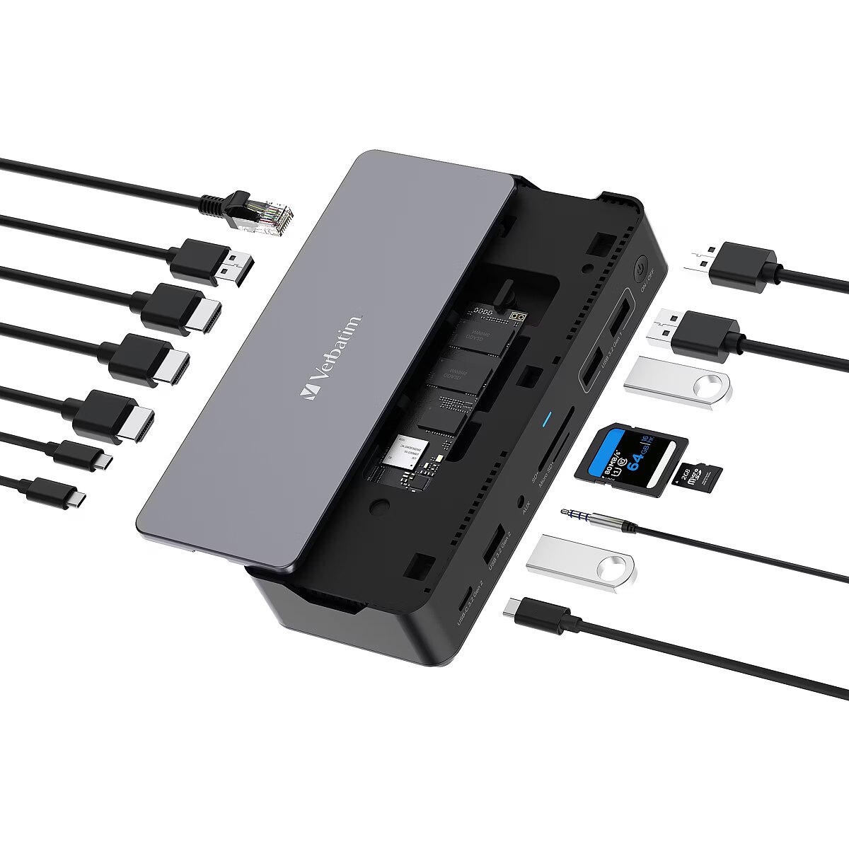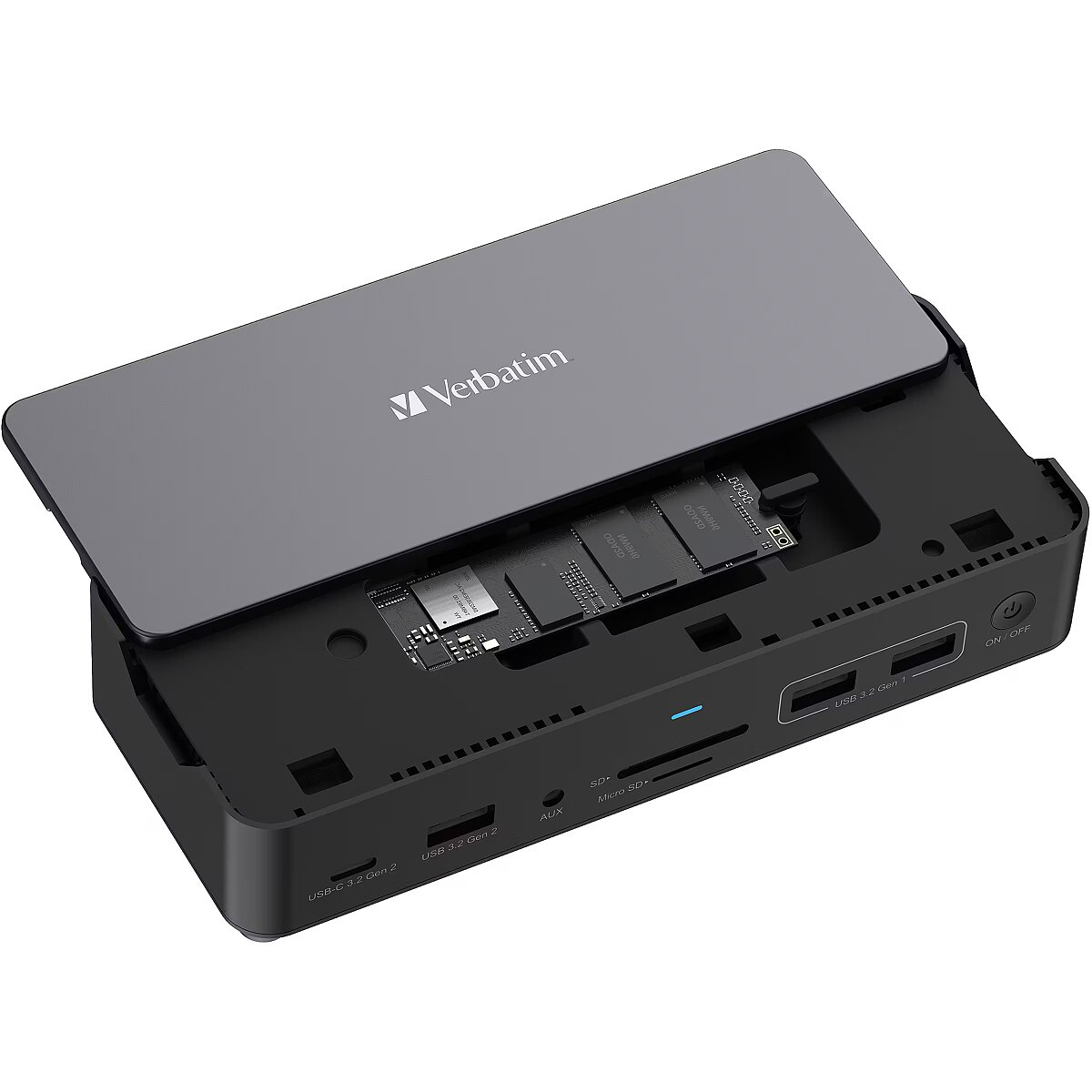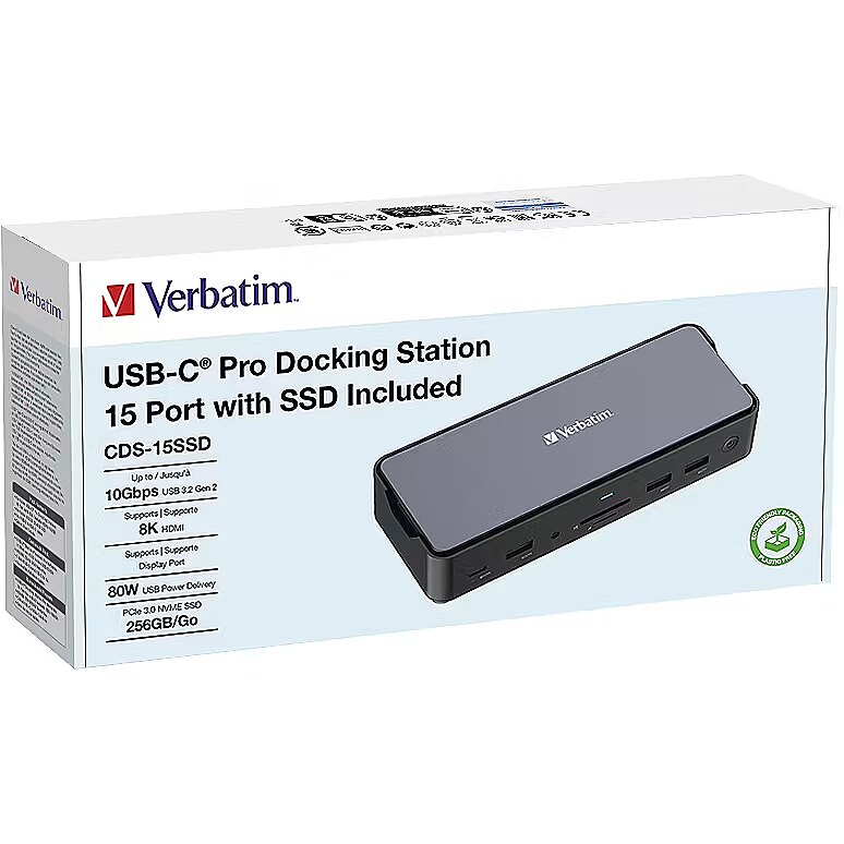 LongDesc - Unleash your productivity.Empower your workspace with the Verbatim CDS‑15S256 docking station ideally suited for professionals handling data‑intensive tasks.The high‑performance docking station features one USB‑C 3.2 Gen2 and two USB‑A 3.2 Gen2 ports for rapid data transfer plus USB‑A 480 Mb/s and RJ45 ports, and SD/MicroSD slots to ensure versatile connectivity.Your storage needs will be fulfilled with the Verbatim Vi3000 256GB SSD, unlocking rapid access to essential files and simplifying automatic backup. Experience visual brilliance with dual HDMI and single DP 8K connection, facilitating immersive triple display setups