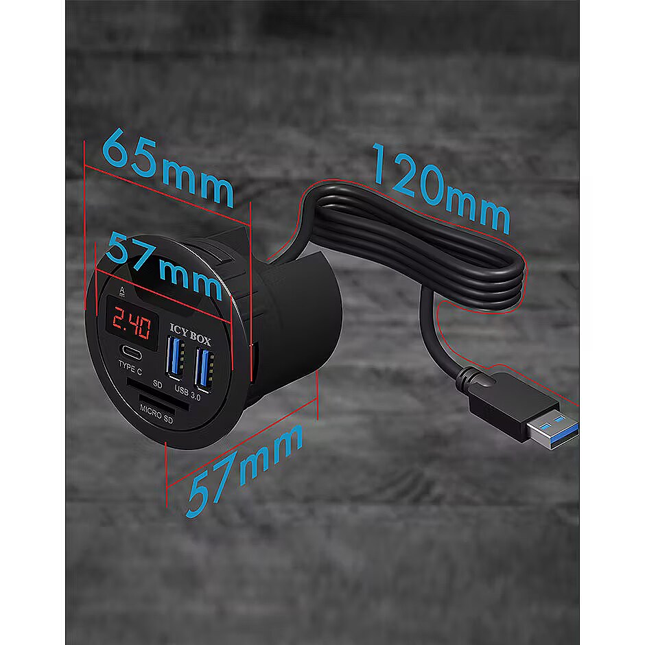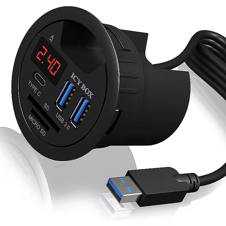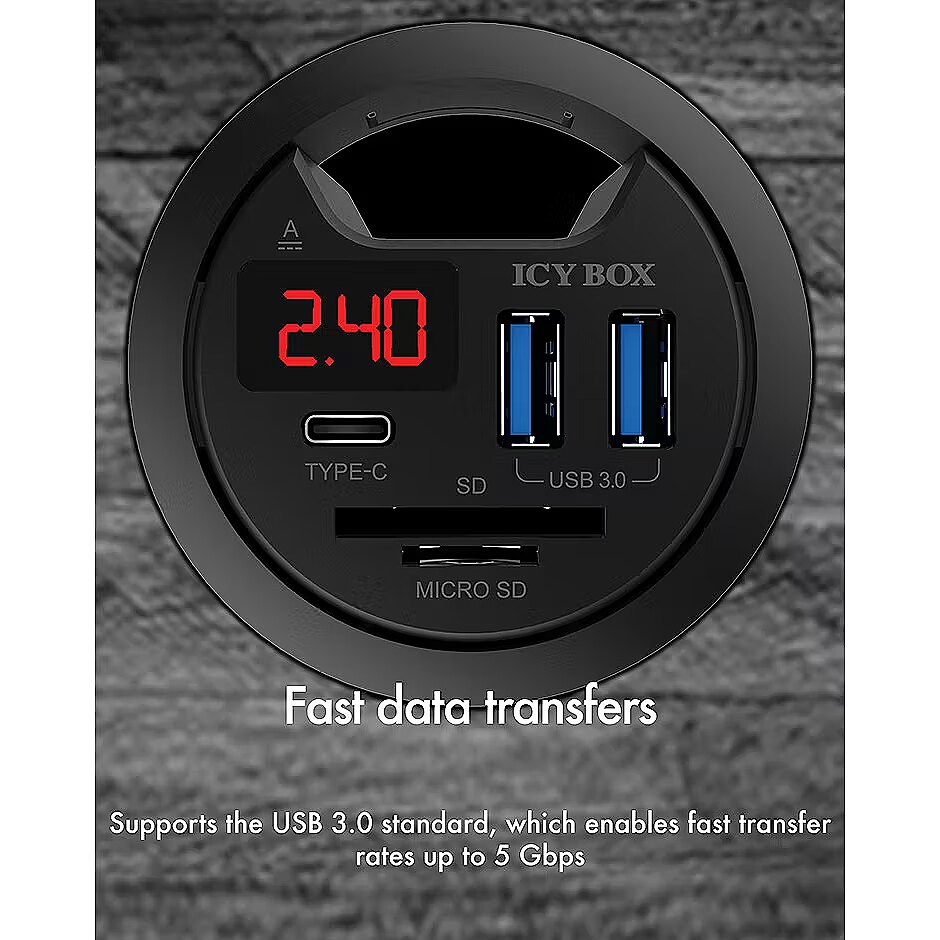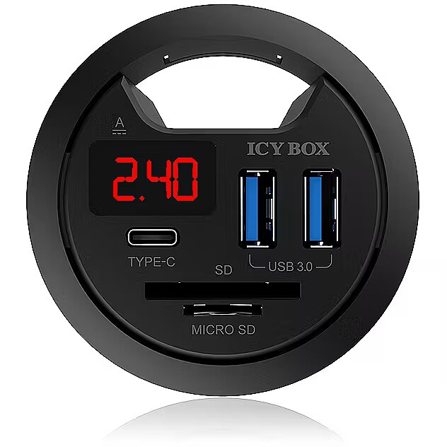 LongDesc - Makes the computer more sociableThe IB-Hub1404 offers two USB 3.0 ports to connect a variety of devices. The SD / MicroSD card reader completes the versatility and a USB Type-C™ connection is available so the latest peripherals can be connected.Fast reading, fast loadingAll USB ports support the charging specification BC 1.2 and USB 3.0 bandwidth and thus transmission rates of up to 5 Gbit/s. On the other hand, the hub is connected via USB 3.0 to a PC or laptop.Good to knowThe Ampere indicator is the special extra of this hub. It shows the charging speed of any device connected to USB port 1.