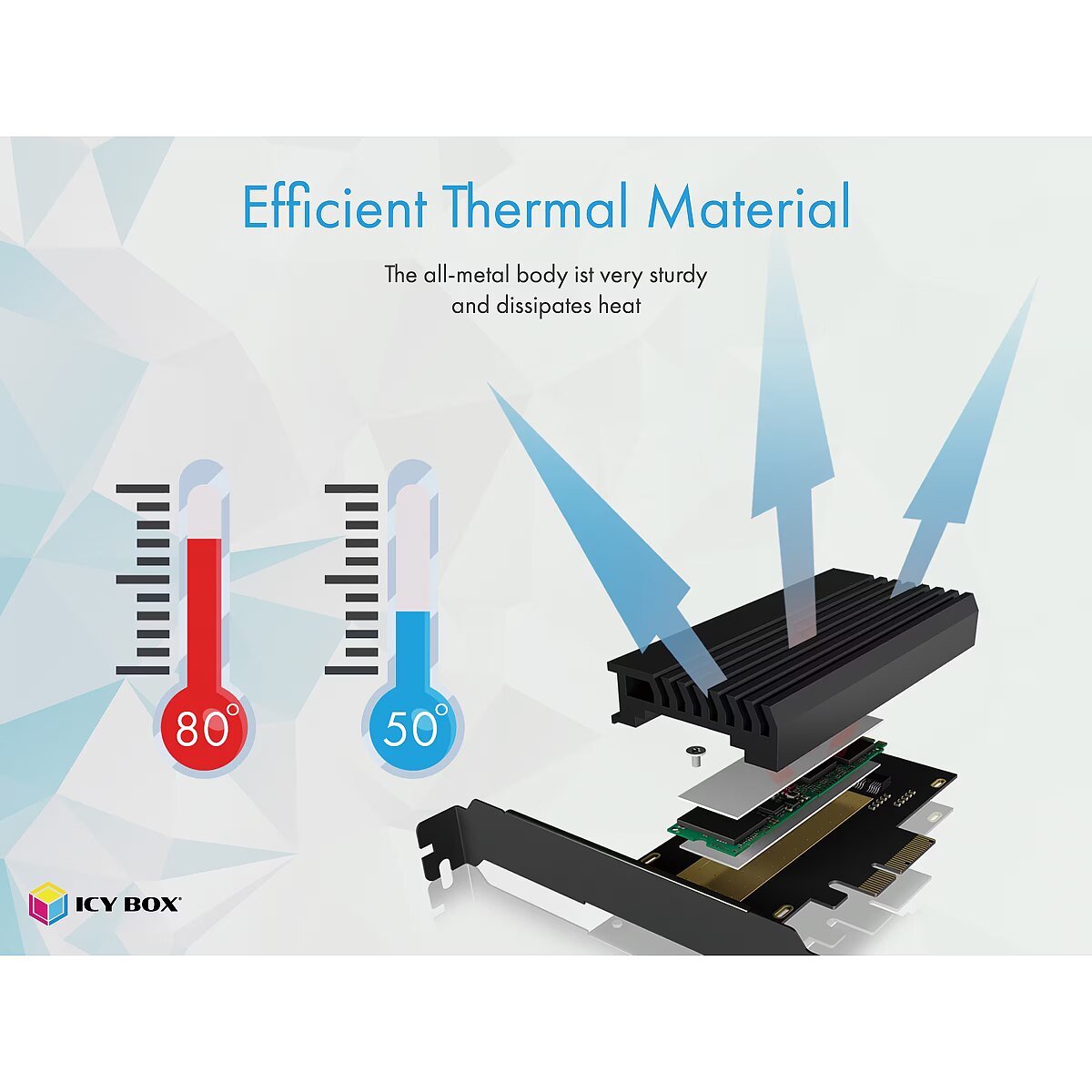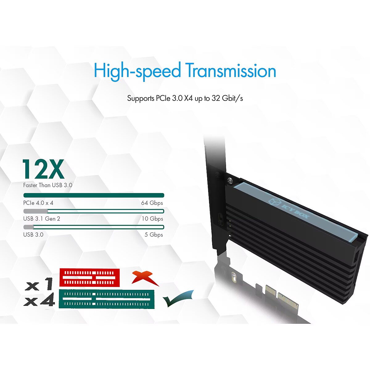 LongDesc - Future-proof expansionWith the PCI expansion card you can easily upgrade older systems to the new level. You can experience all the advantages of a fast M.2 SSD without having to rebuild the whole system again.CustomizableThe IB-PCI214M2-HSL contains both a full and a half profile cover. This means that it can be used in almost any type of housing without any problems. In addition, M.2 SSDs with the dimensions of 22x30/42/60/80 mm can be installed. No matter what configuration you need, the IB-PCI214M2-HSL gives full throttle in any setting.Speed until the board glowsThe current M.2 NVMe SSDs achieve more than five times the speed of traditional SATA SSDs. This enormous power naturally generates a lot of waste heat on the small M.2 cards. In order to protect the card and the system, the speed is throttled if the SSD heats up too much. The IB-PCI214M2-HSL offers enough cooling power with the enclosed heat conduction pads and the large heat sink so that you can enjoy the full power of your M.2 SSD at all times.Power and designThe massive heat sink is not only responsible for temperature control. The integrated acryl glass highlight is illuminated by LEDs and immerses the system in a rich blue tone.
