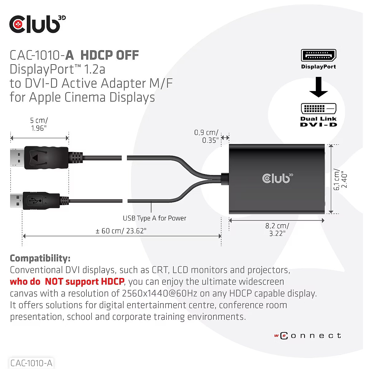 ShortSummaryDescription - CLUB3D DisplayPort to Dual Link DVI-D HDCP OFF version Active Adapter M/F for Apple Cinema Displays, 0.6 m, DisplayPort, DVI-D + USB, Male, Female, Straight