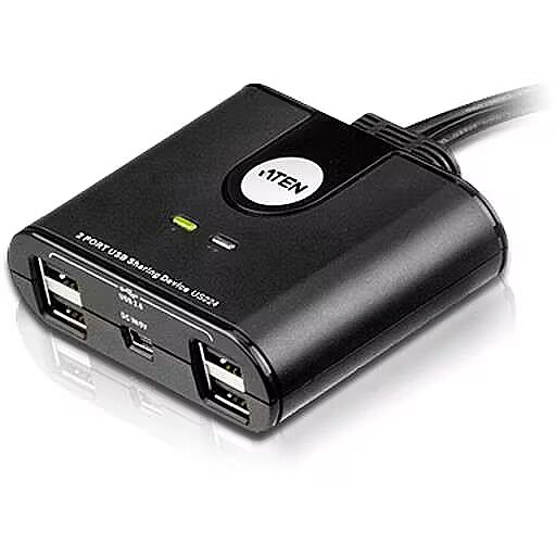 Description - The US224 is a 2-port USB peripheral sharing device that enables 2 computers to share the use of 4 USB devices a keyboard, mouse and up to two peripheral devices. It eliminates the added expense of having a separate USB keyboard, mouse and peripheral device(s) for each computer. The US224 all-in-one design allows for a neat and tidy installation no need to connect 2 separate USB cables to the computer, thus eliminating cable clutter. For extra convenience, it features an external remote port selector that can simplify desktop layout, and select which computer needs to use the USB devices. US224 is the ideal way to share USB peripherals in a multimedia office environment. 4 built in USB ports all-in-one design allows for a neat and tidy installation that reduces cable clutter Enables 2 computers to share 4 USB devices a USB keyboard, mouse and up to two peripheral devices Simple port selection via remote port selector for convenient switch placement Non-powered (supports optional USB power adapter)