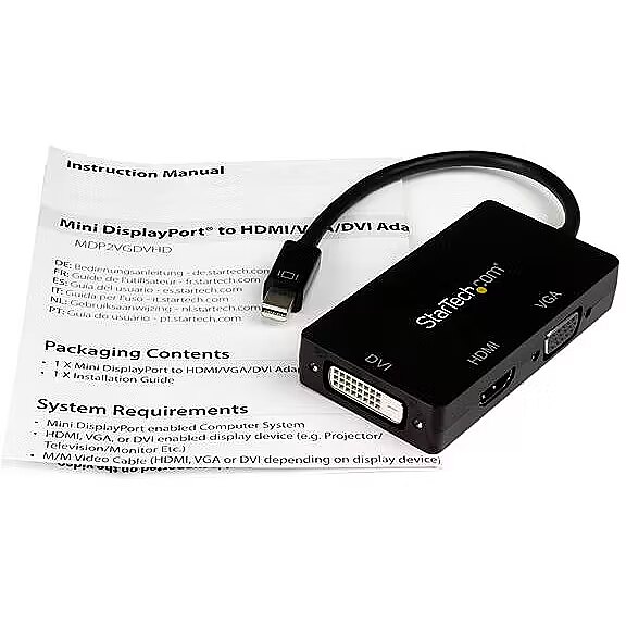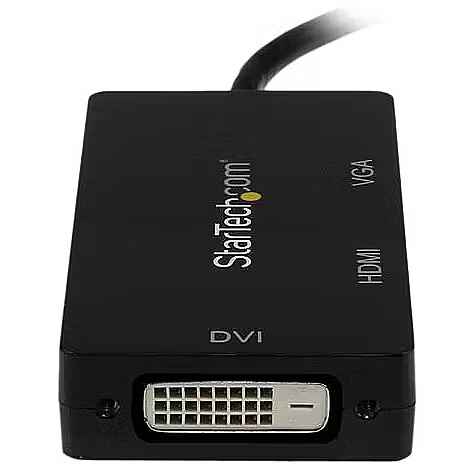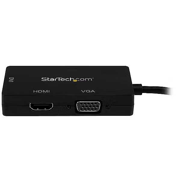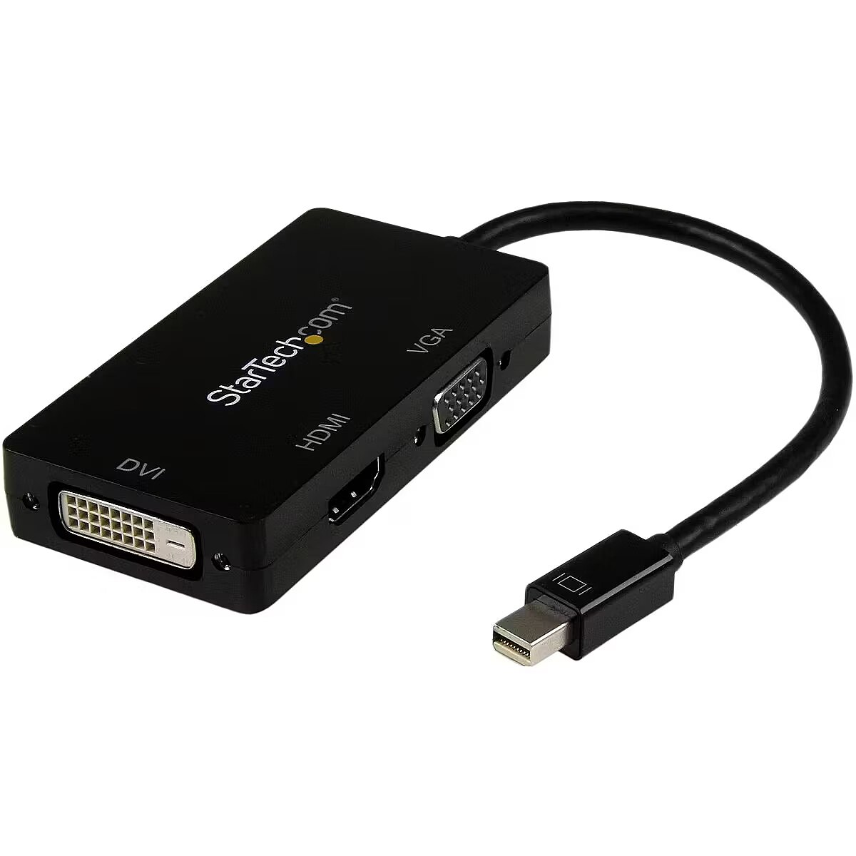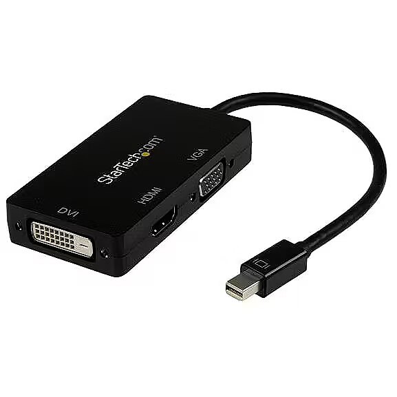 LongDesc - Connect a Mini DisplayPort-equipped PC or Mac to an HDMI, VGA, or DVI DisplayThis travel adapter lets you connect your mDP enabled Ultrabook or laptop computer to any VGA or HDMI display. Backed by rigorous testing to ensure compatibility, the 3-in-1 Mini DisplayPort adapter is the perfect accessory for any of your Microsoft Surface Pro devices that are equipped with mDP.Connect to any HDMI or VGA displayWhy carry multiple adapters when you only need one? Instead of keeping three different adapters on-hand, the mDP travel adapter offers VGA, DVI and HDMI outputs, so you’ll be able to connect from your laptop mDP output to any modern boardroom or classroom display -- an ideal plug-and-play solution for BYOD (Bring Your Own Device) applications at the office. Plus, because the converter supports video resolutions up to 1920x1200 or 1080p you can convert a Mini DisplayPort video source to HDMI, VGA or DVI without sacrificing video quality.Maximize portabilityThe travel A/V adapter maximizes portability with a small footprint and lightweight design. The convenient design ensures the adapter is as portable as your laptop, fitting easily into your laptop bag or carrying case and eliminates the need to carry more than one adapter. With this adapter you can walk into virtually any boardroom ready to present, making a great first impression, and saving you the embarrassment of having to rummage through your bag looking for the right connector.The 3-in-1 converter is compatible with the Intel Thunderbolt port on your computer and installs easily with no software or drivers required.The MDP2VGDVHD is backed by a 3-year StarTech.com warranty and free lifetime technical support.The StarTech.com Advantage- Ensure compatibility with virtually any display with three-in-one adapter converting Mini DisplayPort to VGA, HDMI, or DVI- Maximize portability when traveling or at the office, with a small foot print, and lightweight design