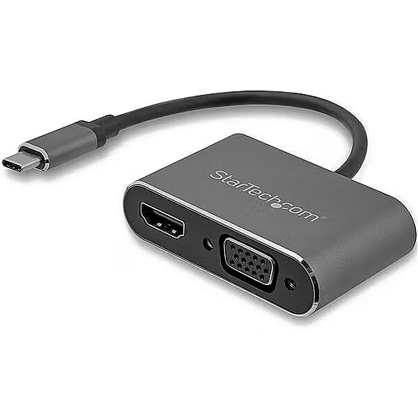 LongDesc - USB-C™ Multiport Adapter| Aluminum | 6" (15.24 cm) Built-In CableThis USB-C to VGA and HDMI adapter offers a portable solution for connecting your USB Type-C laptop to a VGA or HDMI display. The multiport video adapter also works as a splitter, enabling you to simultaneously output an identical video signal to two separate monitors (1 x HDMI and 1 x VGA).Two-in-One Video Connectivity with Travel in MindAvoid the hassle of carrying different adapters, with a 2-in-1 USB-C monitor adapter. With VGA, and HDMI outputs, you can conveniently connect your laptop to any HDMI or VGA-equipped display, using this multiport adapter.The adapter features a durable aluminum enclosure and can withstand being carried in your travel bag.Ultra HD 4K 30Hz ResolutionThe HDMI output on this USB-C video adapter supports UHD resolutions up to 4K 30Hz, while the VGA output supports HD resolutions up to 1920 x 1200.Stylish Connectivity for Your MacBook, MacBook Pro, or Any LaptopThe USB-C video adapter has a Space Gray housing and built-in USB-C cable designed to match your Space Gray MacBook or MacBook Pro. The adapter is compatible with USB-C DP Alt Mode devices.CDP2HDVGA is backed by a StarTech.com 3-year warranty and free lifetime technical support.The StarTech.com Advantage