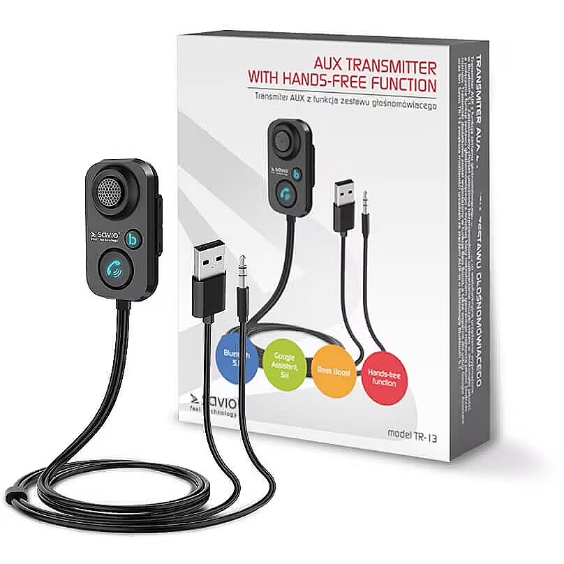 AUX raidītājs SAVIO TR-13 ar brīvroku funkciju ir daudzfunkcionāla ierīce, kas aprīkota ar Bluetooth 5.1. Izmantotais mikroshēmojums ļauj bezvadu stereo mūzikas atskaņošanu izcilā kvalitātē. Brīvroku funkcijas un augstas klases mikrofona kombinācija zvanu laikā garantē vislabāko kvalitāti. Raidītājs papildus ir aprīkots ar Bass Boos funkciju, kā arī atbalstu Google Assistant un Siri pakalpojumiem. Savio TR-13 palielina ierīču iespējas ar AUX savienotāju, pievienojot tehnoloģiju Bluetooth 5.1.