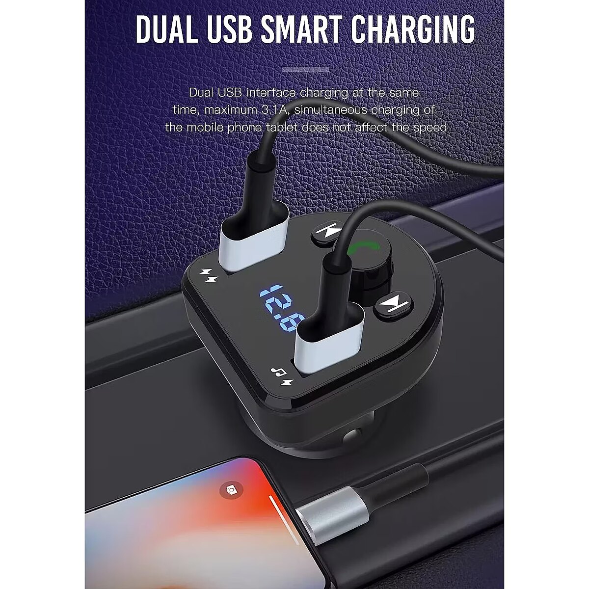 description_short_en - FM transmitter for your car Wireless Bluetooth connection Two USB ports for charging: max 3.1 A Allows you to listen to music from a flash drive LED display